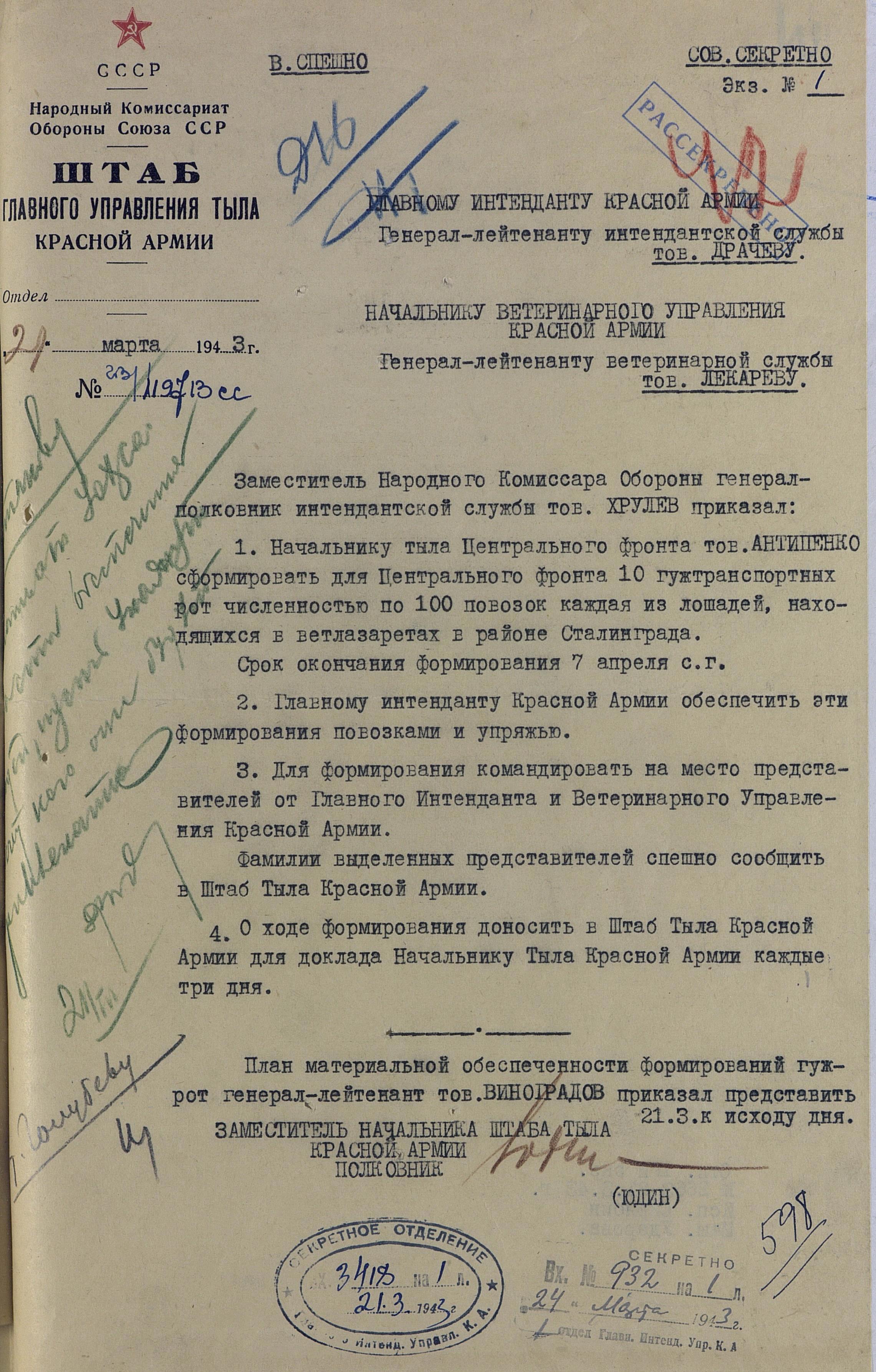 Также известно, что в дни Сталинградской битвы на фронтах работали 209 гужевых транспортных рот фронтового и армейского подчинения, численность лошадей в которых составляла более 30 тысяч голов.