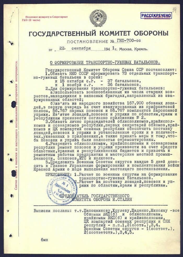 По постановлению ГКО от 22 сентября 1941 года Наркомат обороны должен был сформировать 73 отдельных транспортно-гужевых батальона к 1 ноября 1941 года.