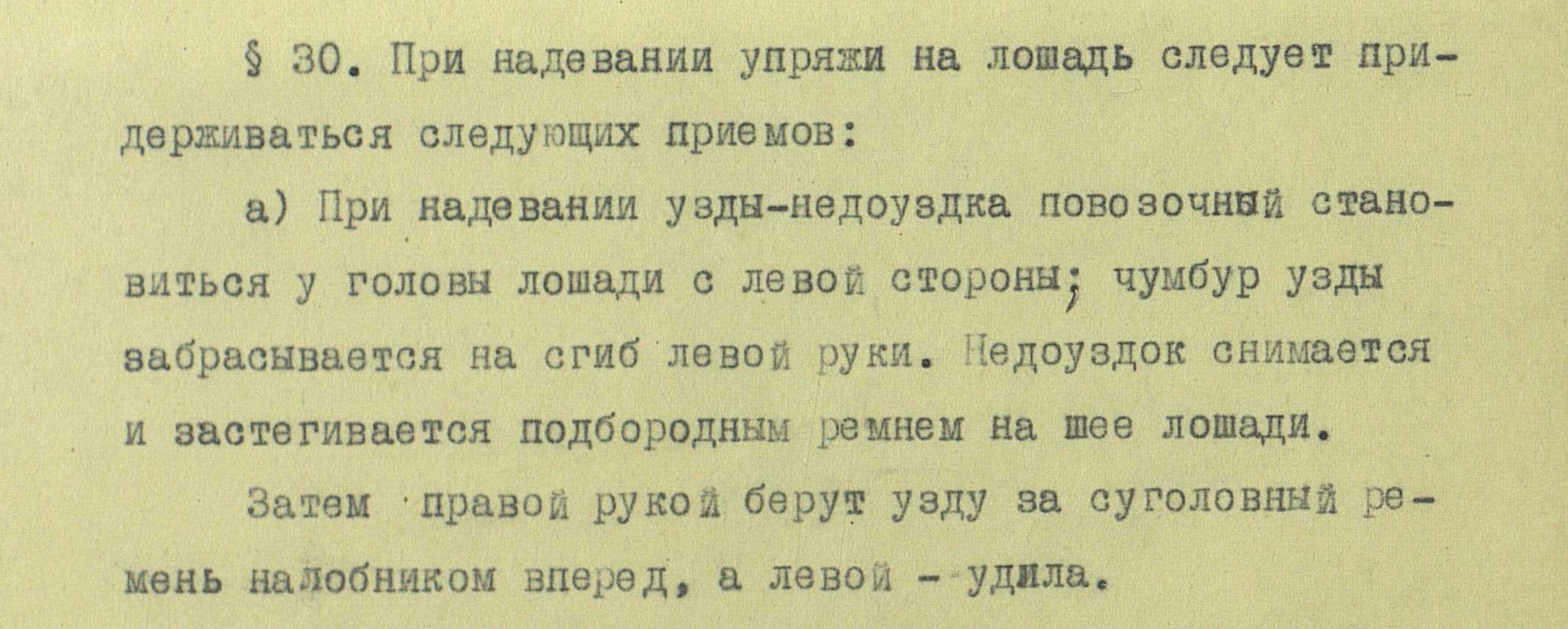 Тема надевания упряжи на лошадей достаточно популярна. В интернете по ней можно найти целые диссертации. Но, некоторые нюансы, присущие армии, в них отсутствуют. Например: какие команды подаются в тех или иных случаях. Почему есть команда «отпрягай», а не «распрягай» я понял только с третьего раза, внимательно перечитав текст. Во-всяком случае — надеюсь, что правильно понял. Или то, что возница считается «мёртвым грузом»… Такое только военные и могли придумать, объединив все виды постоянных грузов, от веса повозки, до запаса фуража для лошади и запаса продовольствия для повозочного. А уж особенности движения по труднопроходимой местности или меры ПВО читаются на одном дыхании, как приключенческая книжка.