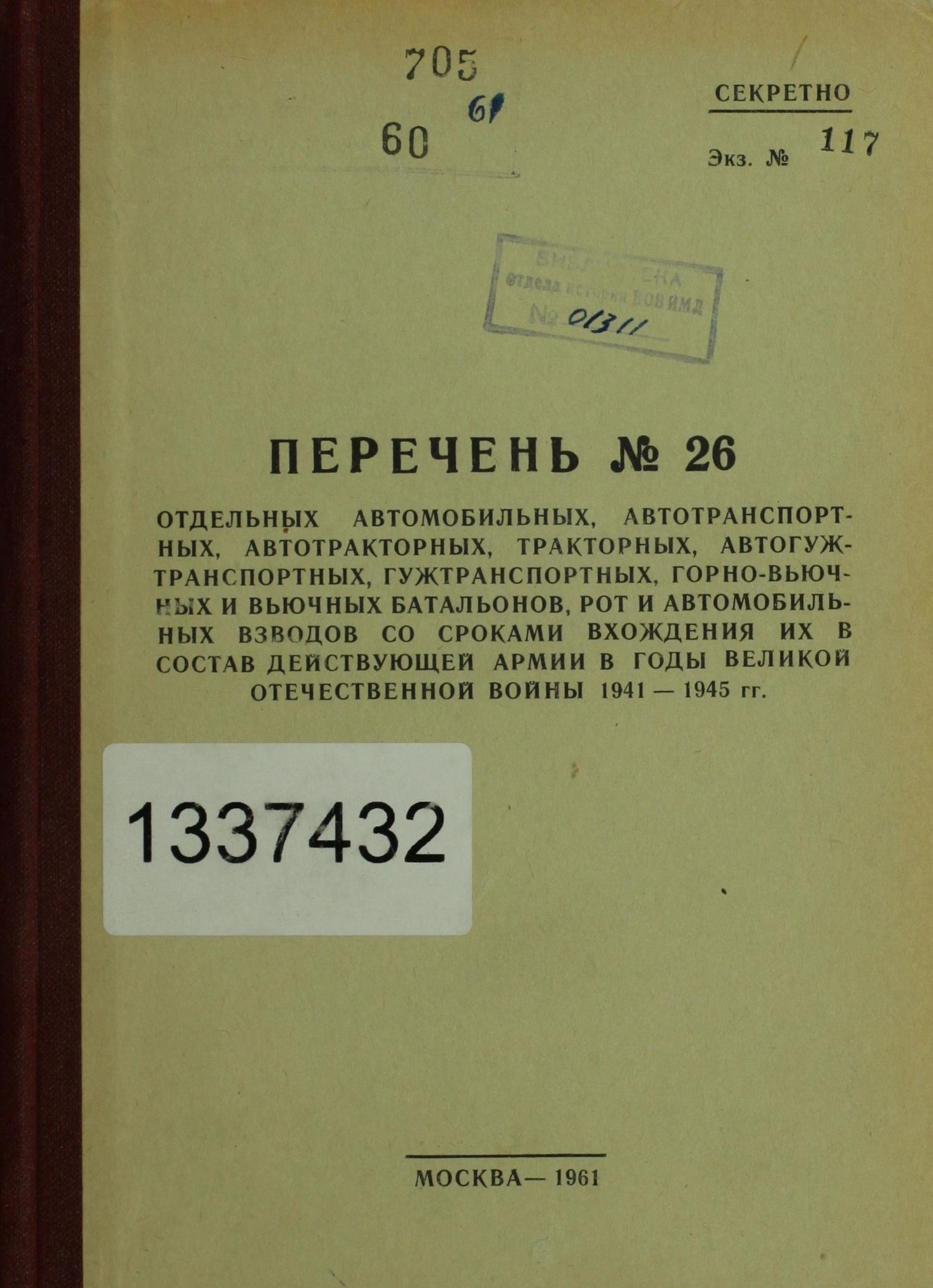 (полностью документ можно прочитать на https://docs.historyrussia.org/ru/nodes/268008-perechen-locale-nil-26-otdelnyh-avtomobilnyh-avtotransportnyh-avtotraktornyh-traktornyh-avtoguzhtransportnyh-guzhtransportnyh-gorno-vyuchnyh-i-vyuchnyh-batalonov-rot-i-avtomobilnyh-vzvodov-so-srokami-vhozhdeniya-ih-v-sostav-deystvuyuschey-armii-v-gody-velikoy#mode/inspect/page/1/zoom/4)