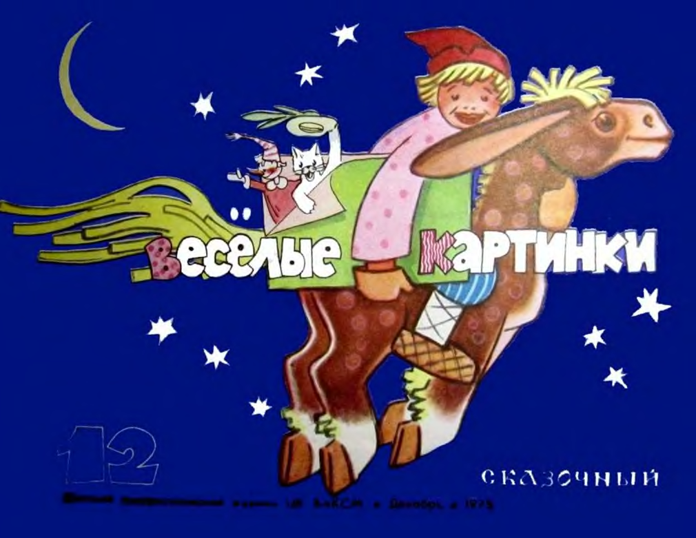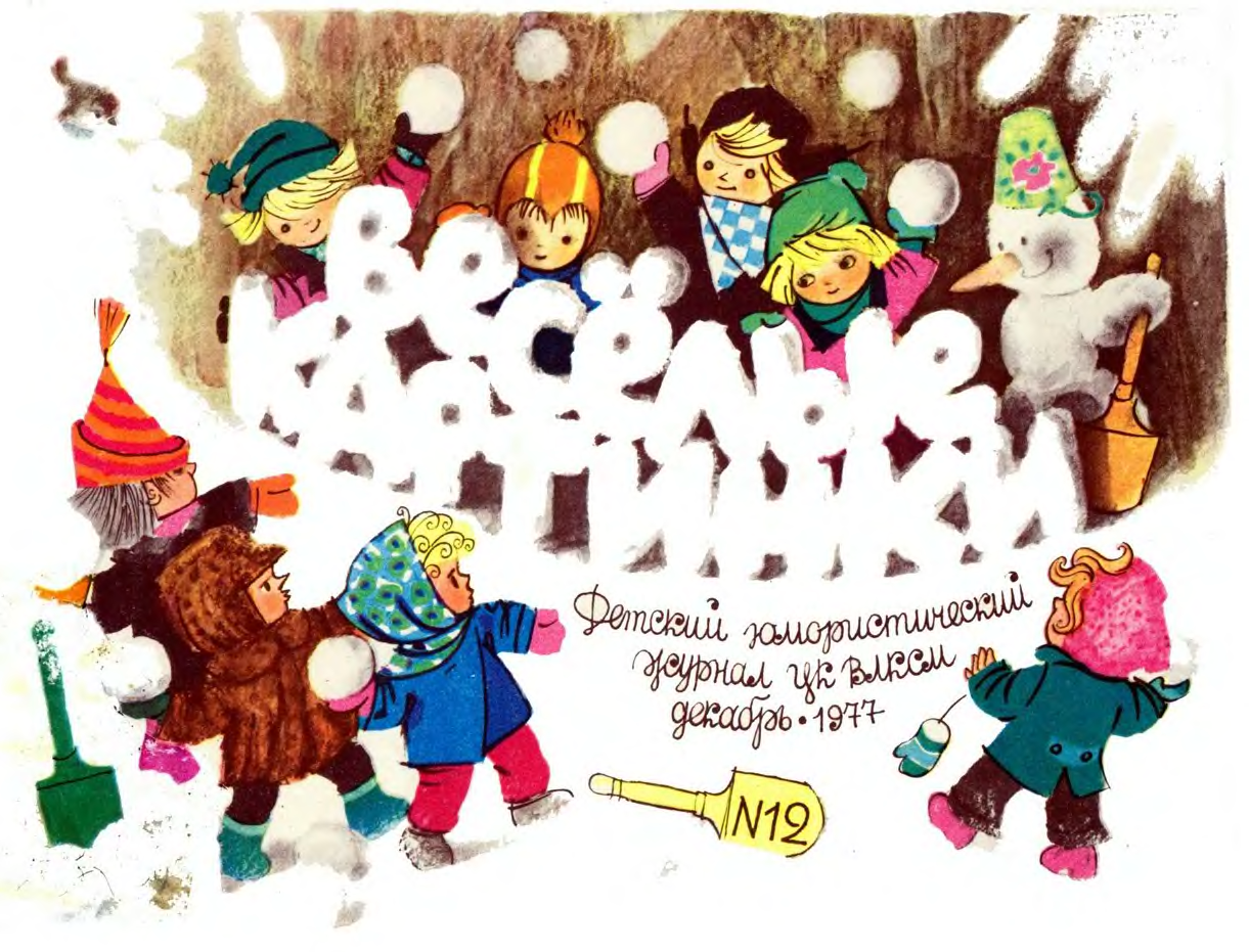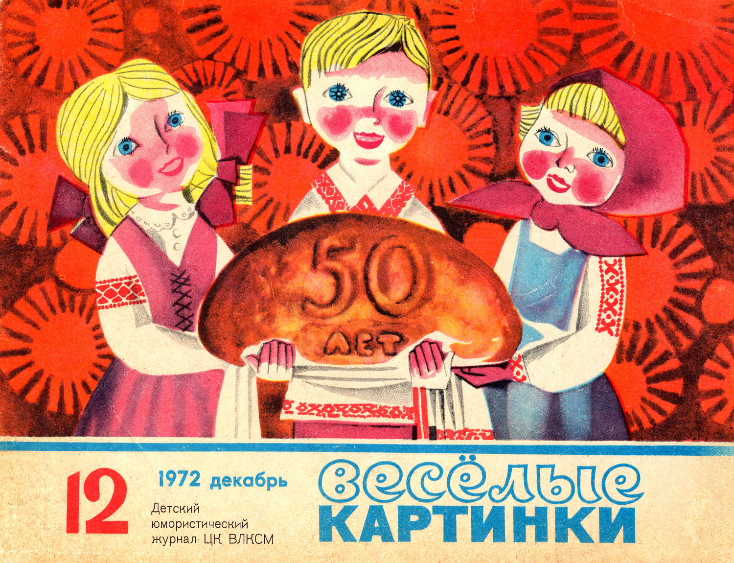 Декабрьский номер 1972 года был посвящен 50-летию СССР. Внутри - никакого Нового года, только стихи и рисунки из республиканских детских журналов. Люди, уверявшие меня, что популярность "Веселых картинок" связана исключительно с отсутствием альтернативы - записывайте. «Геярчин» - детский журнал Азербайджанской ССР, «Тяхеке» - детский журнал Эстонской ССР, "Скынтея ленинистэ" - детский журнал Молдавской ССР, "Пионер" - детский журнал Туркменской ССР, "Малятко" - детский журнал Украинской ССР, «Машъал» - детский журнал Таджикской ССР, «Балдырган» - детский журнал Казахской ССР, «Дила» - детский журнал Грузинской ССР, "Жаш ленинчи" - детская газета Киргизской ССР, «Зилите» - детский журнал Латвийской ССР, «Генис» - детский журнал Литовской ССР, «Цицернак» - детский журнал Армянской ССР, "Вясёлка" - детский журнал Белорусской ССР, "Гунча" - детский журнал Узбекской ССР. И имейте в виду - это в основном журналы для младших школьников, для пионеров были свои, вроде украинского "Барвинка". Рисунок на обложке - В. Шарановича (Минск).