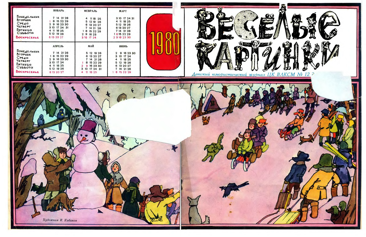 В 1979 году, как вы видите, художник-нонконформист Виктор Пивоваров, еще один из основоположников московского концептуализма, нарисовал знаменитый логотип журнала, состоящий из «букв-человечков», который используется до сих пор. А рисунок на обложке, как и год назад - кисти Ильи Кабакова. Кривомордые снеговики пришли в журнал всерьез и надолго.