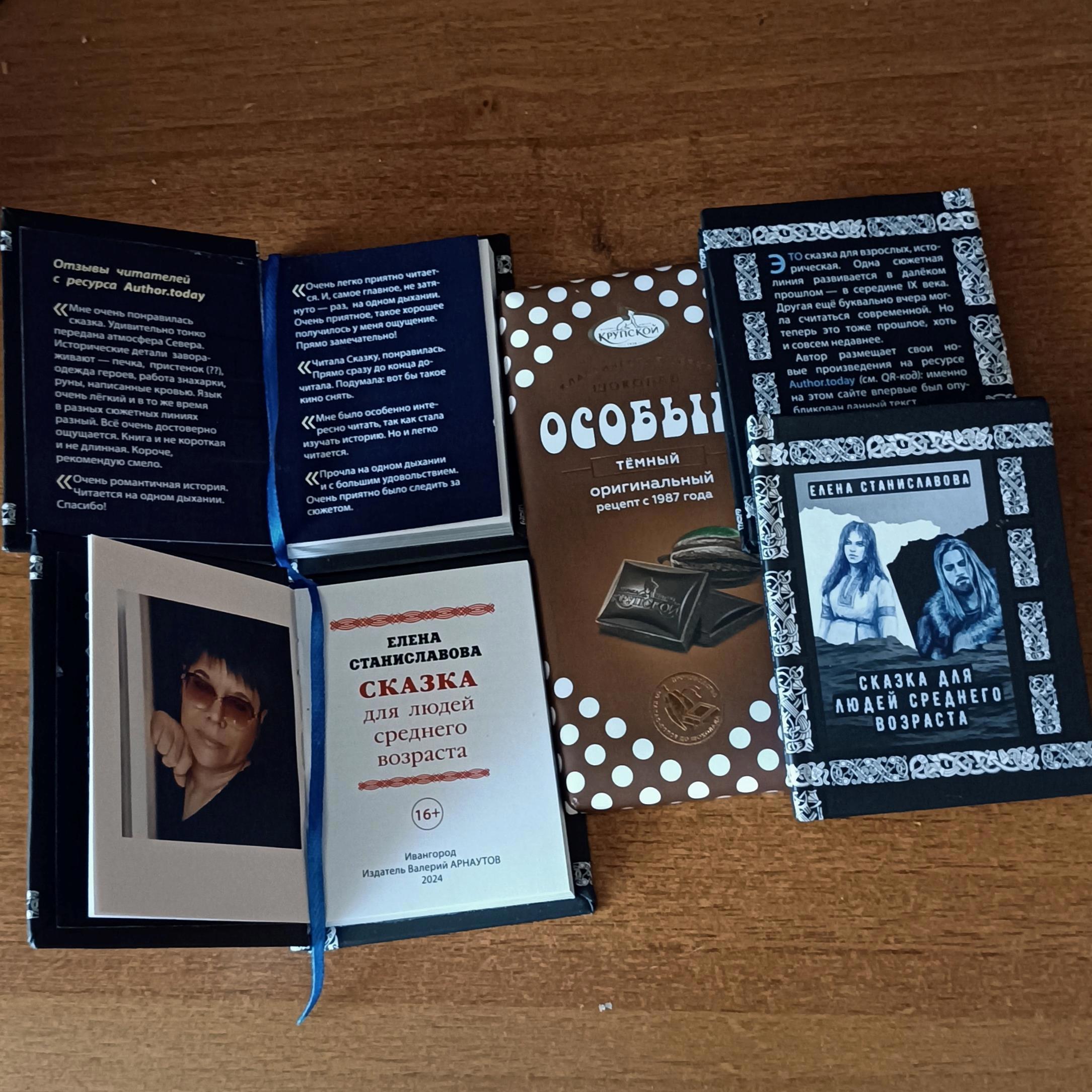 Автор: Елена СтаниславоваМне был нужен был подарок для очень хорошего человека, но такой, необычный, что ли, прямо вот личный и чтобы удивить. Поскольку я — автор, могла бы подарить свою книгу. Но обычной книгой сегодня кого-то удивить сложно. А вот издатель https://author.today/u/id11061158 предложил изготовить четыре моих книги "Сказка для людей среднего возраста" в сувенирном исполнении: размер 65х90 мм (по обложке — 80х105) — в виде микрокниги. Причём все в цвете и с цветными иллюстрациями!