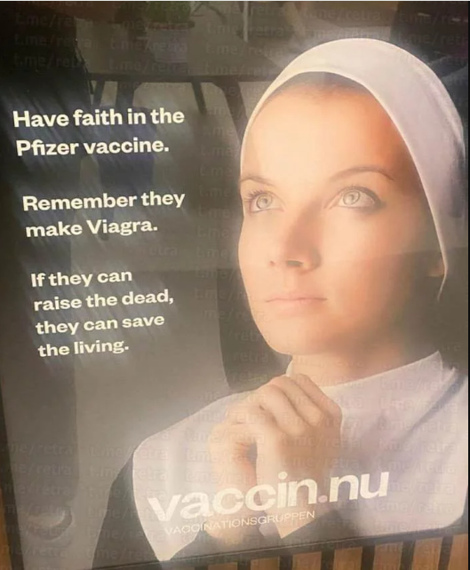 «Уверуйте в вакцину от Pfizer. Помните, они производят Виагру. Если они могут поднять мёртвое, то им под силу спасти живых»