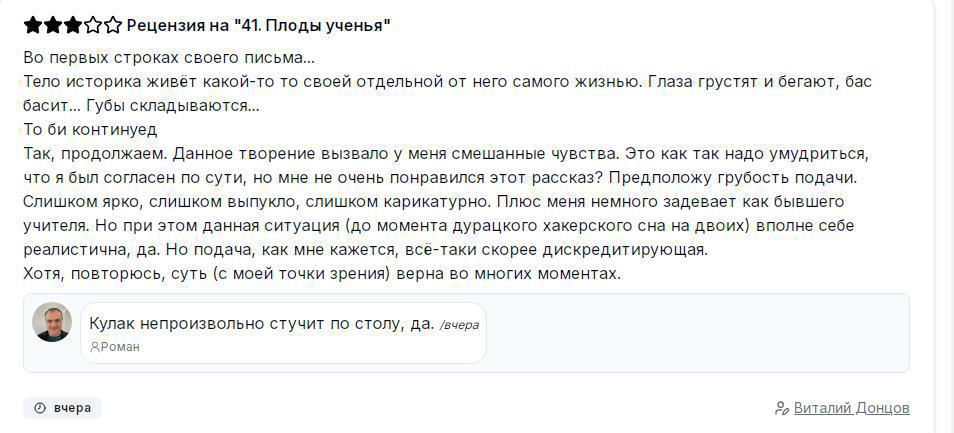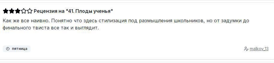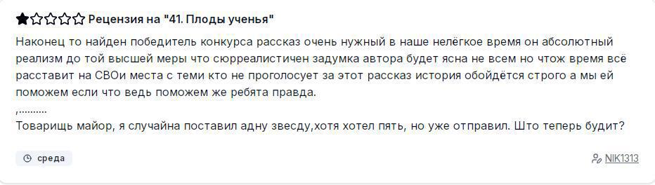 Отзывы о конкурсных работах отзыванты писали тут https://criticat.org/competition/034ab16d-5a72-4228-8368-b962e65fb1f9/reviews?&