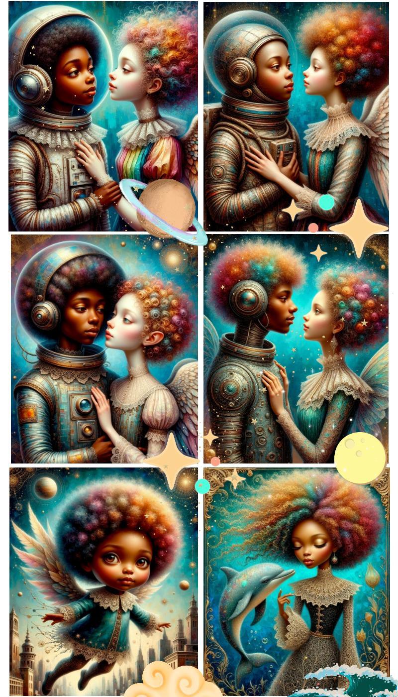 Юный астронавт и девочка-ангел гуляли между мирами, взявшись за ручки.