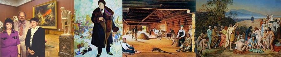Я на ломаном русском языке стал доказывать, что я свой исконно советский. Фразы типа " Товьярищ женщина, их Бин коренной житель Псков Таун, приехать ист на экскурсий с кольхоз "имени Кобыл Буденный маршал", приводили в дикий восторг моих друзей, и только усиливали подозрения альгвазил-дамен, и группы поддержки из милых музейных смотрительниц. Когда мои друзья уже устали хохотать, я предъявил бдительной вахте свой "Серпастый и молотокастый" и меня скрепя сердцем пропустили. И в превосходном настроении мы начали осмотр экспозиции, причем милые театральные униформистки бдительно за нами присматривали, передавая по эстафете из зала в зал, ну а Ваш покорный слуга сеял Разумное, Доброе, и что характерно, Вечное, в чем не мало преуспел. Надо сказать, что, видя внимание окружающих экскурсантов к моим лекционным эссе, я стал включать в свои повествования о шедеврах, разъяснения будто бы скрытых в них смыслах и это тоже имело успех. Например, когда в зале Верещагина, я гордо показал друзья банкетку на которой несколько часов сидел перед "Помпеями" восхищённый Вальтер Скотт, среди посетителей началась чуть ли не драка, за право посидеть на раритете. В зале Айвазовского, я естественно рассказал историю брига "Меркурий", но естественно без шуток. У портрета Шаляпина кисти Кустодиева, я упомянул, что шикарная шуба на портрете, была гонораром певцу за концерт, от благодарных красноармейцев. Мы сразу же устроили бурную полемику по поводу того, а где же красноармейцы взяли этот прикид (вариантов было только два, отняли или сперли).