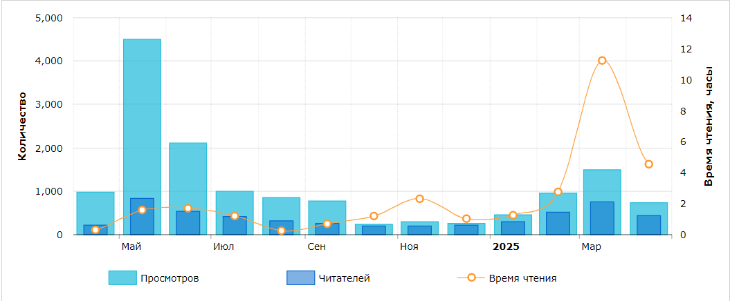 В марте очевидный рост (особенно по времени чтения), совпадающий с датой выкладки двух моих произведений целиком. Факт - ознакомительные фрагменты представляют для читателей меньший интерес. Тем не менее в апреле спад. Кто хотел, прочитал в марте. Полагаю в мае всё вернётся к среднегодовым значениям.