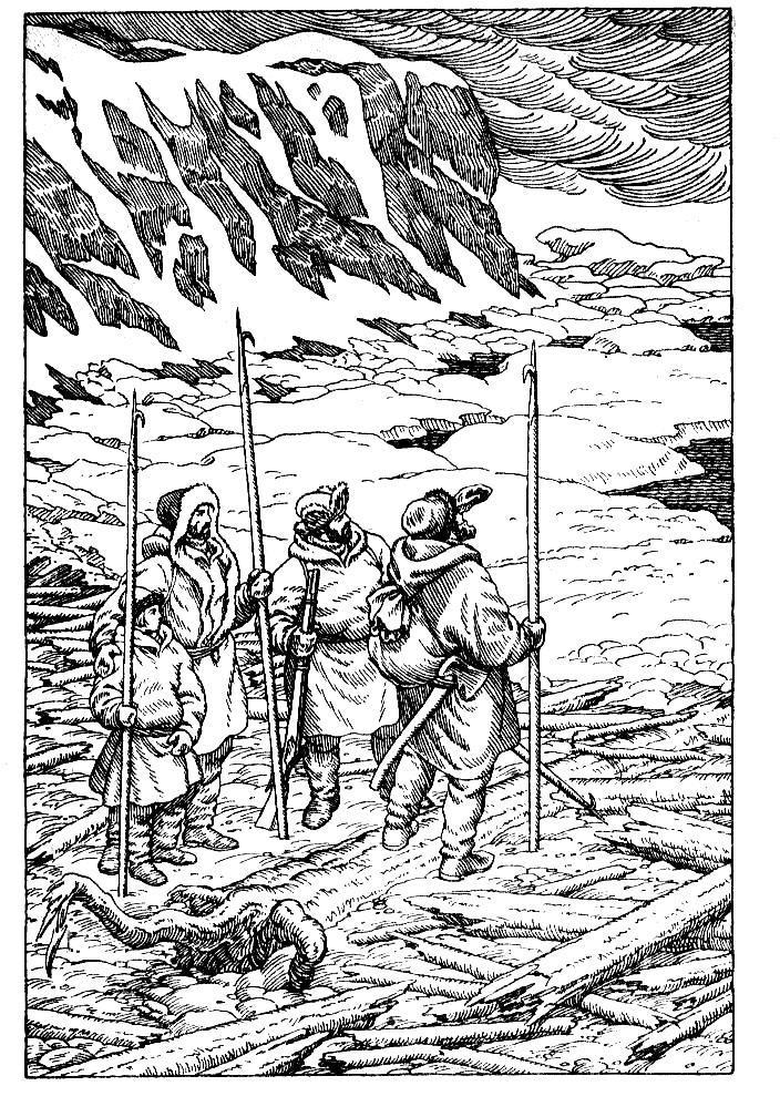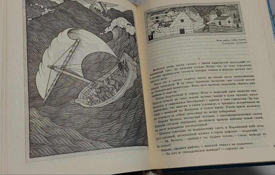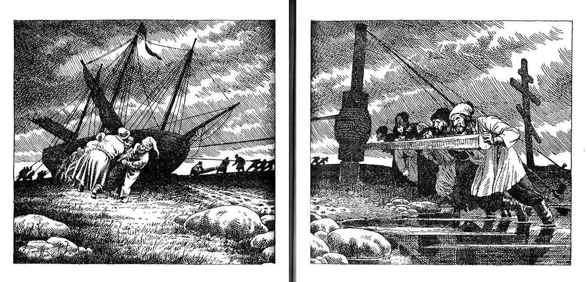 Отдельно проходит третья, где главным мотивом становится смекалка, находчивость и настоящая дружба, нужная на море как нигде. Неизвестные устья рек вдоль незнакомых берегов, неизвестные люди, говорящие неизвестным языком, опасность на пустом месте и царское слово, поперёк коего пойдёшь – беды не оберёшься. В общем – нескучная жизнь тех самых людей, что открывали Бездну, лежащую за Камнем, за Уралом. Они шли, где своей волей, где принуждением воевод, а где наймом купчин, как атаман Ермак Тимофеевич или лихой Семён Дежнёв, Атласов и прочие, в конце концов добравшиеся даже до Аляски.