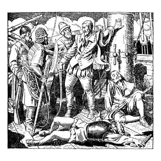 Сама обложка, к слову, весьма честна. Пусть и лубочно, но изображённый на ней маневр, вполне вероятно, мог иметь место. Сам факт отбития судна у злокозненных «лайми» Флота Его Величества случился в период наполеоновских войн, бриташки оказались посрамлены простыми русскими мужиками, а описано оно всё легко, не умаляя крохотной трагедии команды.