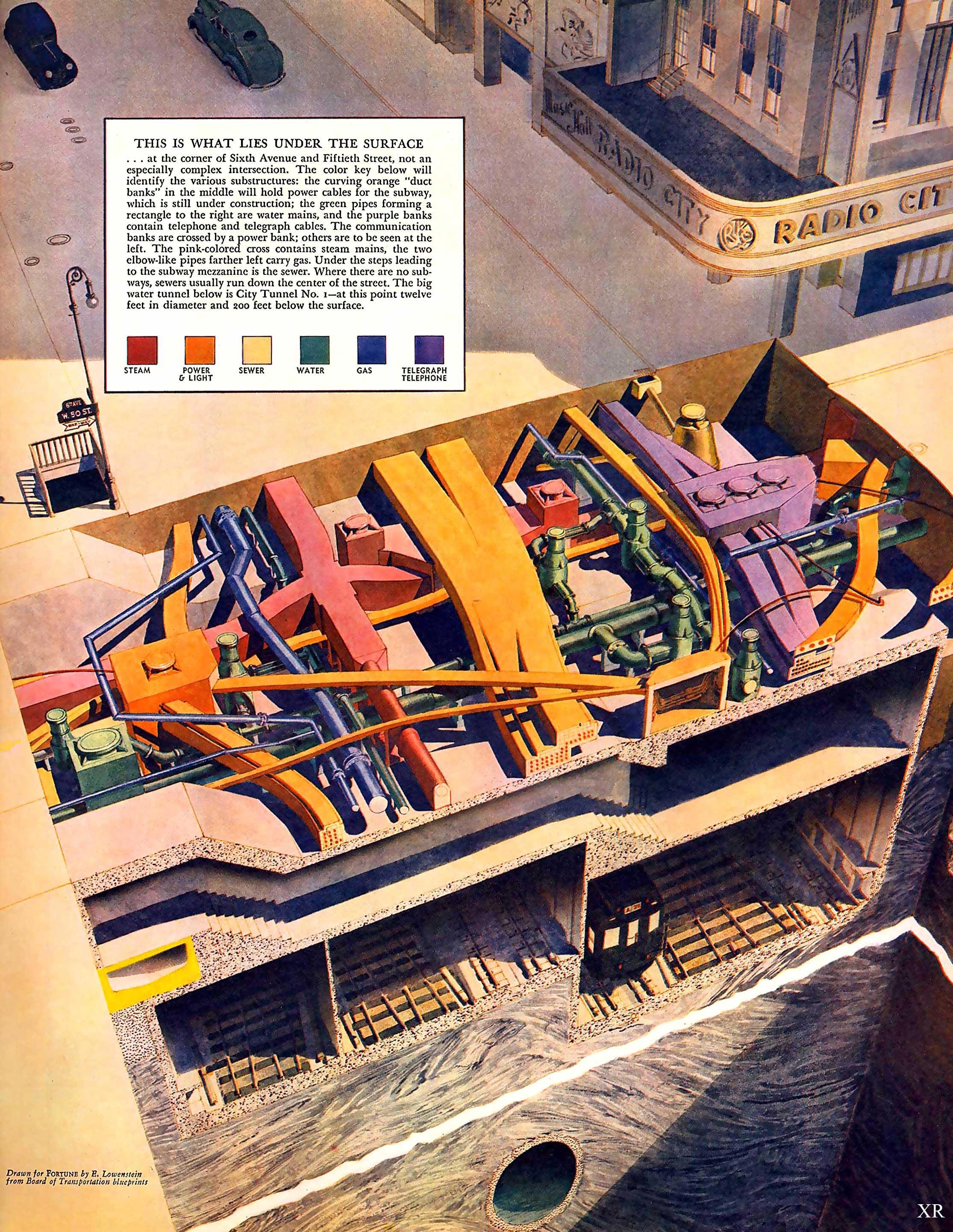 Подземный городской транспорт - двухэтажный пассажирский состав и транспортный с небольшими контейнерами. У локомотива боковые блистеры. Я так понимаю, для контроля грузов. А то перевозка по городу, мало ли кто заберется. Нынче в США негры обожают это дело - поезда потрошат чуть ли не на промышленной основе.