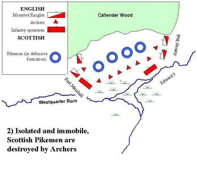 Пешие "англичане" с разбегу воткнулись в шотландцев, но, внезапно, там стало больно. Нестерпимо больно. Битва была очень кровавой, при чем, в первую очередь для англичан. Вернее для того сброда из которой состояла армия Эдуарда. Короче, победа была не очевидна.