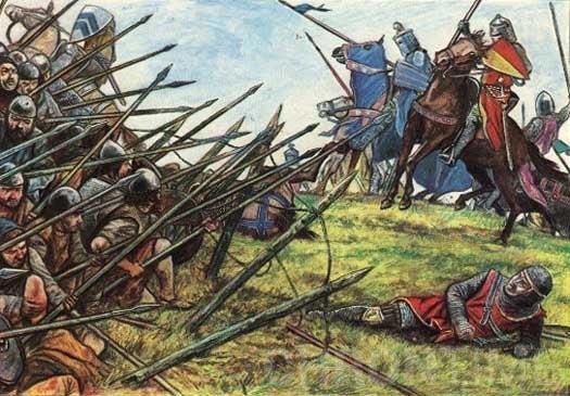 Интересно проследить за Эдуардом. Эдик принял на себя командование центром английской армии – это скорее традиция. Увидев противника, английская конница немедленно бросилась в атаку, однако из-за небольшого болота, располагавшегося перед шотландским построением, она вынуждена была сделать крюк, обойдя болото с западной стороны и только затем врезалась в позиции правого фланга шотландцев. Славный своей кротостью и ударом слева Епископ Даремский, командовавший правым флангом англичан, пытался сдержать своих воинов от преждевременного вступления в бой, чтобы дать возможность королю построить войска перед битвой, однако "под давлением нетерпеливых и спесивых рыцарей он вынужден был начать атаку". Обратите на это внимание – точно такую же несдержанность при виде врага и нечувствительность к приказам рыцари будут демонстрировать постоянно.