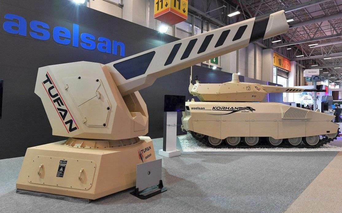 Зато трудно не услышать про то, что волна, поднятая сэшэашниками, оказалась весьма заразительной, хотя может быть, что скорее заразной. Пройдусь по её следам в мировом оружейном дурдоме. В 2019 году (сэшэашники тогда ещё про свой провал с «рейлганами» не объявили) грозно похвалились успехами… вы не поверите – турки! Да, именно они так прямо и заявили, что у нас всё на мази, пушка под названием «Tufаn» отлично стреляет и дырки в бронеплитах толщиной 75 мм успешно пробивает. Хотя более подробных данных об их оружейном успехе они не представили. Вот фотка с выставки, которая проходила в 2018 году: