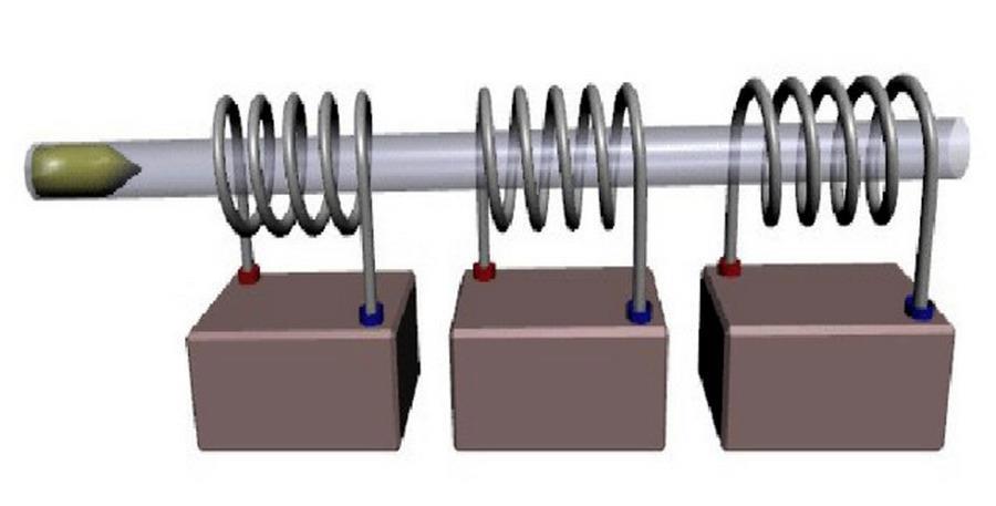 У нас во многих заметочках шибко грамотные журналюги тоже частенько валят в одну кучу и «рельсотроны» и «пушки Гауса». Хотя оба варианта про электромагнетизм, но вообще-то принцип действия у них немного отличается. Дабы не утомлять почтеннейшую публику (и самому не перенапрячься) покажу картинки из интернета. Смотрите и не путайте. Значит «пушка Гауса» – это когда вот так: