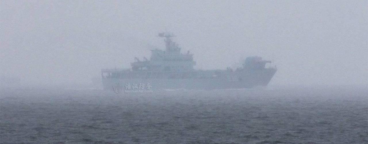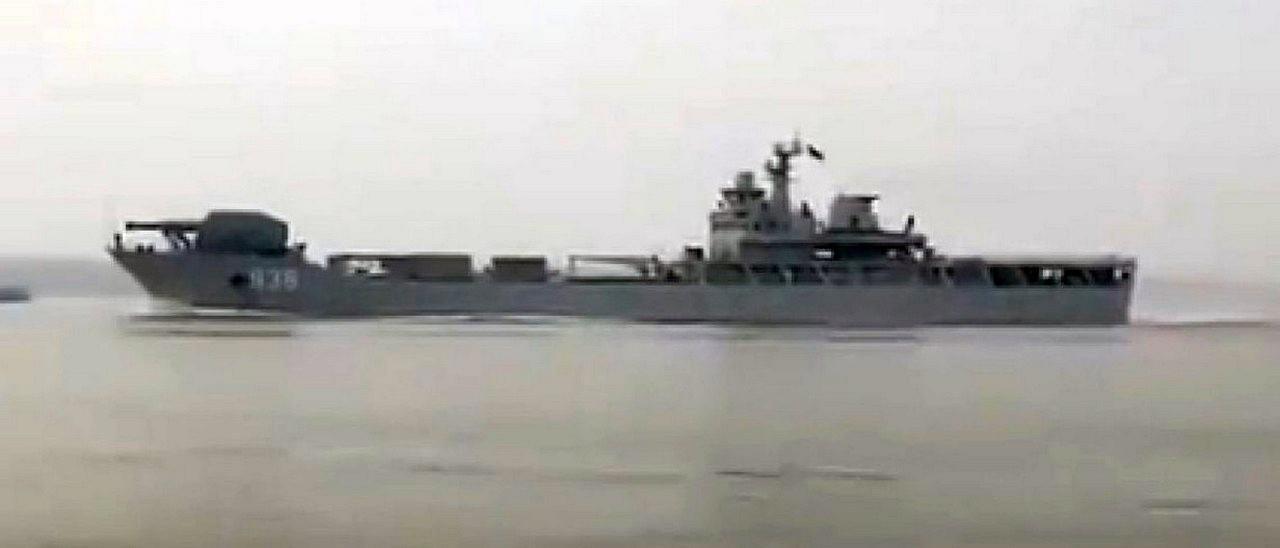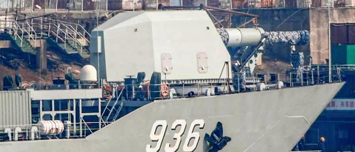 Здесь, кстати, видно, что пушка установлена на носу корабля. Это китайский большой десантный корабль. Видимо в его трюме разместили дополнительные топливо, сервисные системы и генераторы, для питания китайской пушки Гауса. Вот этот корабль во время проведения испытаний: