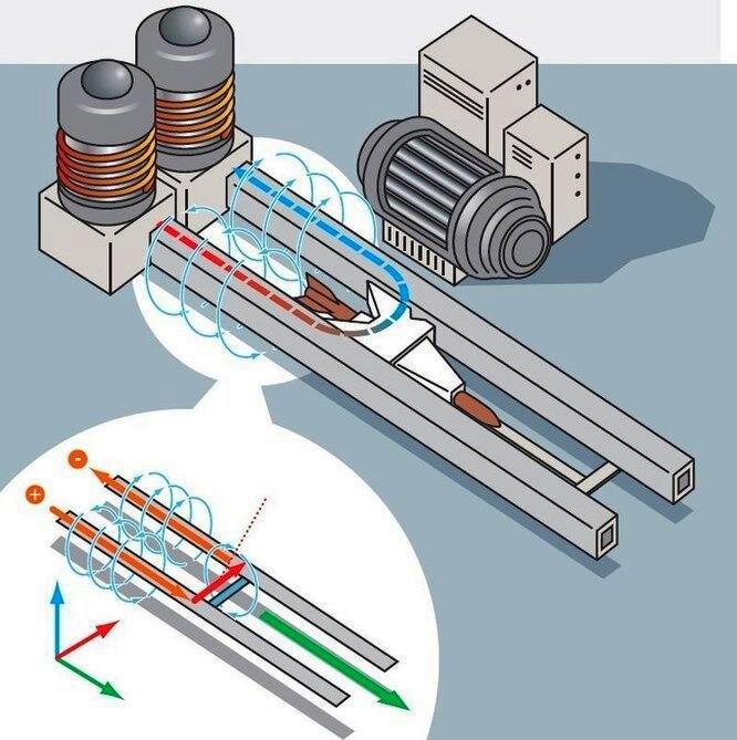 Да и сама принципиальная схема рельсотрона позволяет развивать эту идею не только вперёд, но и в ширь. Не зря и наши, и китайские специалисты время от времени заговаривают о том, чтобы использовать идею рельсотрона для запуска космических аппаратов на орбиту. Ещё одна интересная мысль вытекает из одного недостатка рельсотрона – это нагрев снаряда во время выстрела. Он ведь паразит так греется, что может вообще сгореть! То есть превратится в облачко плазмы… а это значит, что пусть себе горит на здоровье, ведь плазма тоже ток проводит. То есть выстрел по любому состоится. Просто пушка выстрелит не болванкой, а сгустком плазмы… и чё будет? Да, пролетит, наверное, недалеко, но… что будет с объектом, который попадёт в это облако? А? Может быть имеет смысл подумать над тем, как это облачко поддержать на дистанции, скажем в пять километров?