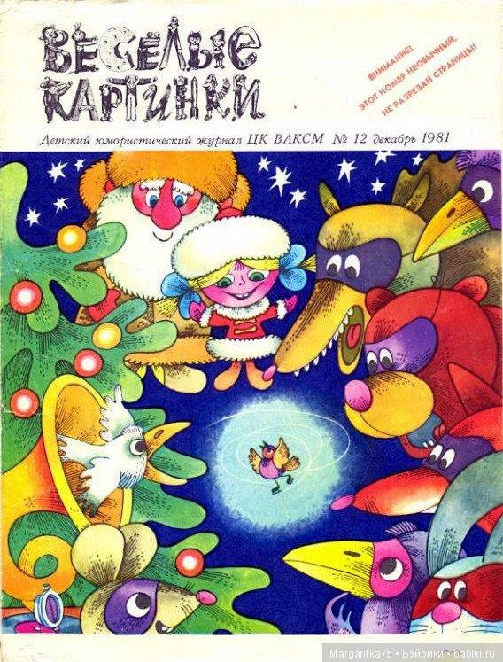Новогодний номер 1981 года также обычным не назовешь. Как вы сами видите на обложке, читателя зачем-то просят не разрезать страницы. На самом деле надо было просто отогнуть скрепки, отделить обложку, развернуть журнал - и получить перекидной календарь на 1982 год. Обложка - художника Наталии Стойко.