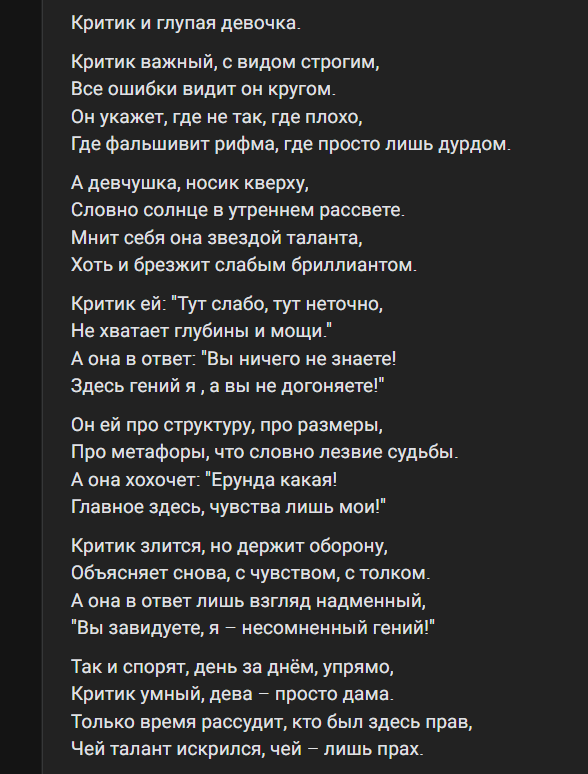 Мне тут написали саркастическую поэму (где высмеивают меня), причиной раздора послужила вчерашняя рецензия на "Ищущего во мраке". посмотреть можно здесь если еще не видели нашу коллабу с Марковым https://author.today/post/637629