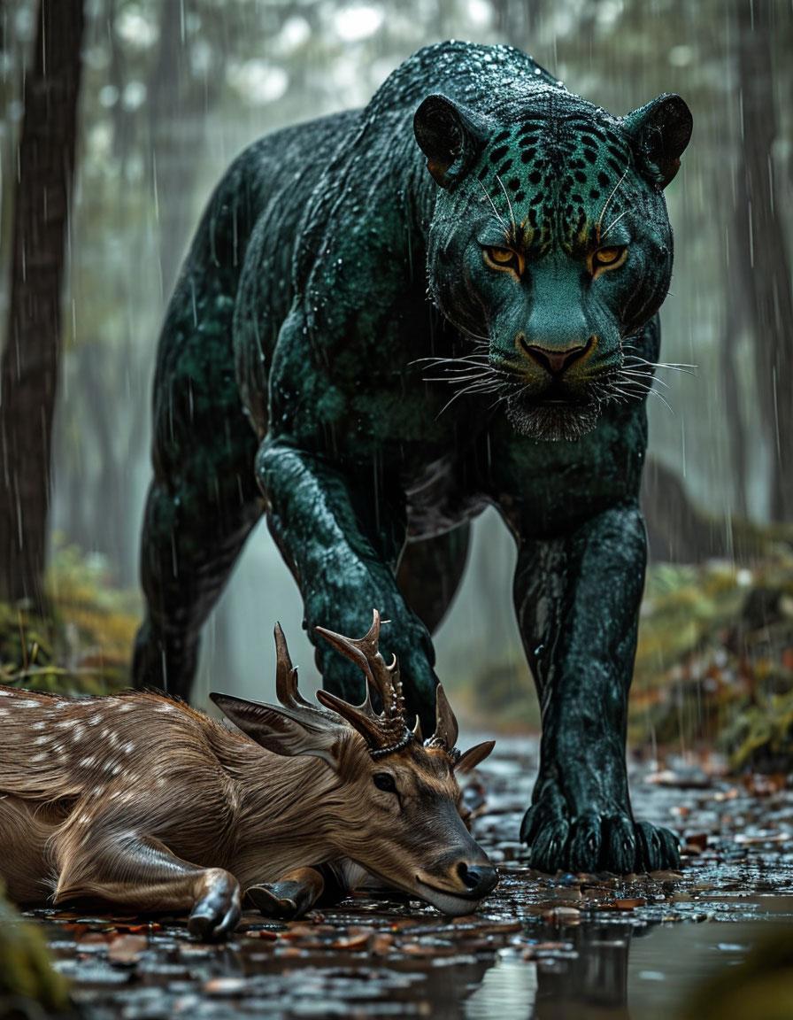 Девушка выругалась, что не взяла с собой плащ. Быстро разобрала лук, чтобы лишний раз не мочить хотя бы его и, скинув с плеча колчан, убрала его туда. Очень близко Франческа услышала низкий рык и подняла голову. Над мертвой тушей стояла большая темно-зеленая кошка, размером с пантеру или барса. Огромную мощную лапу та поставила на шею косули, выпустив когти размером с палец. Вонзившись в тело, из-под каждого побежала струйка красной крови, почти сразу размываясь струями воды.