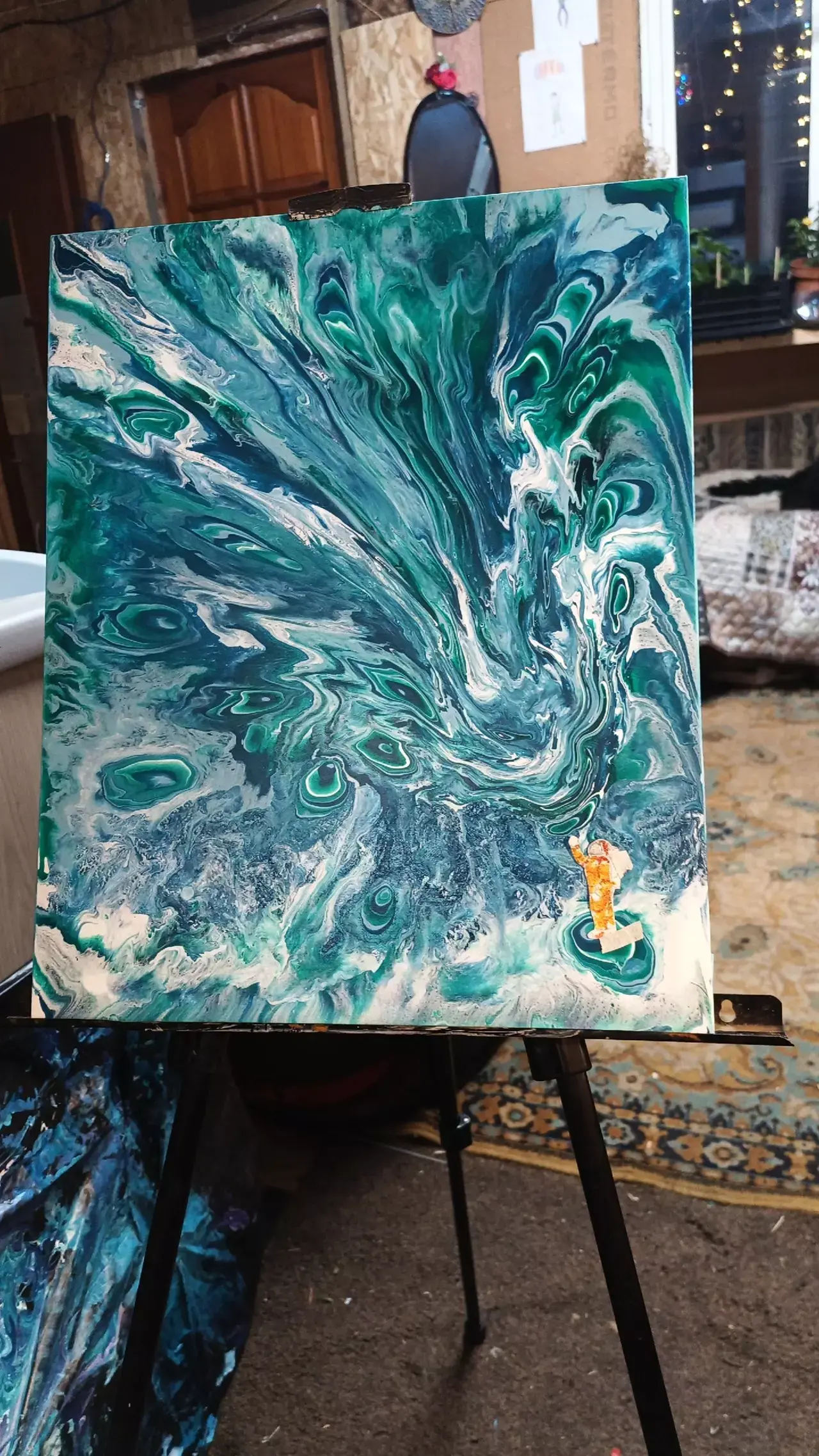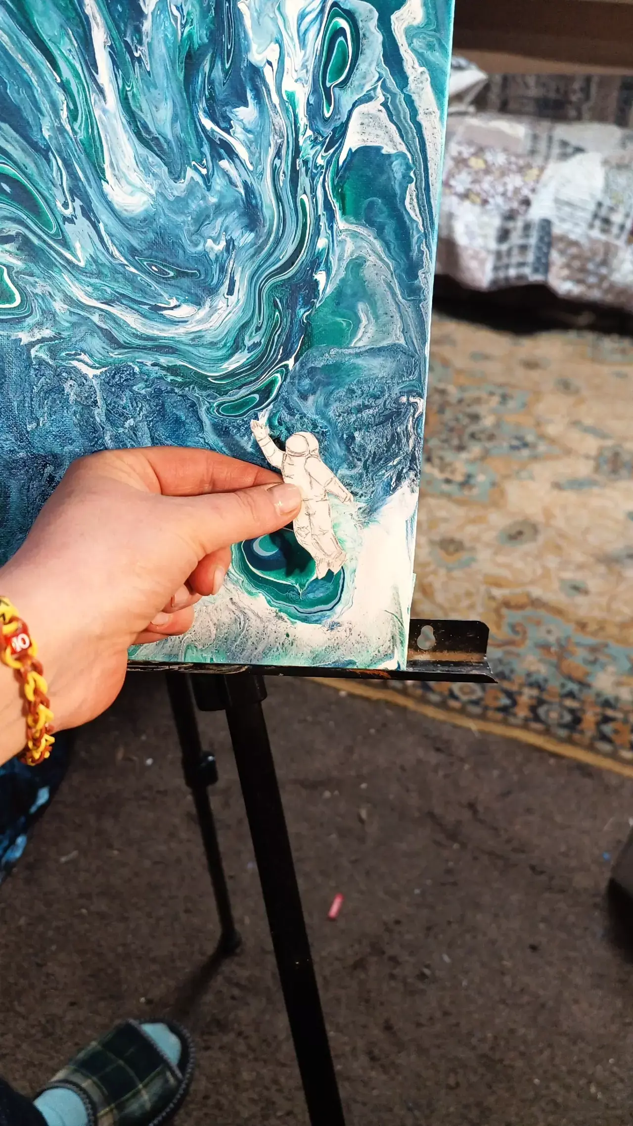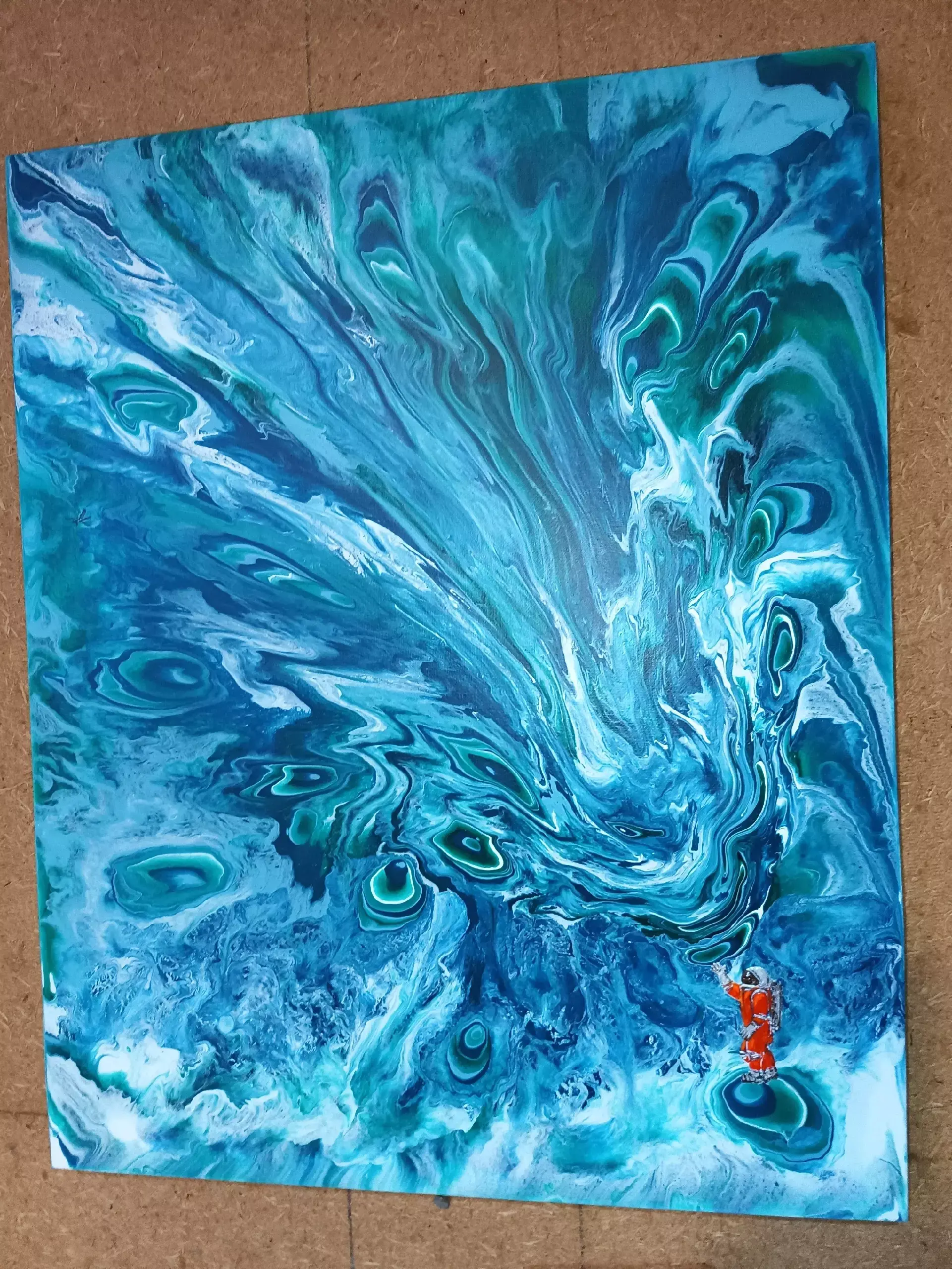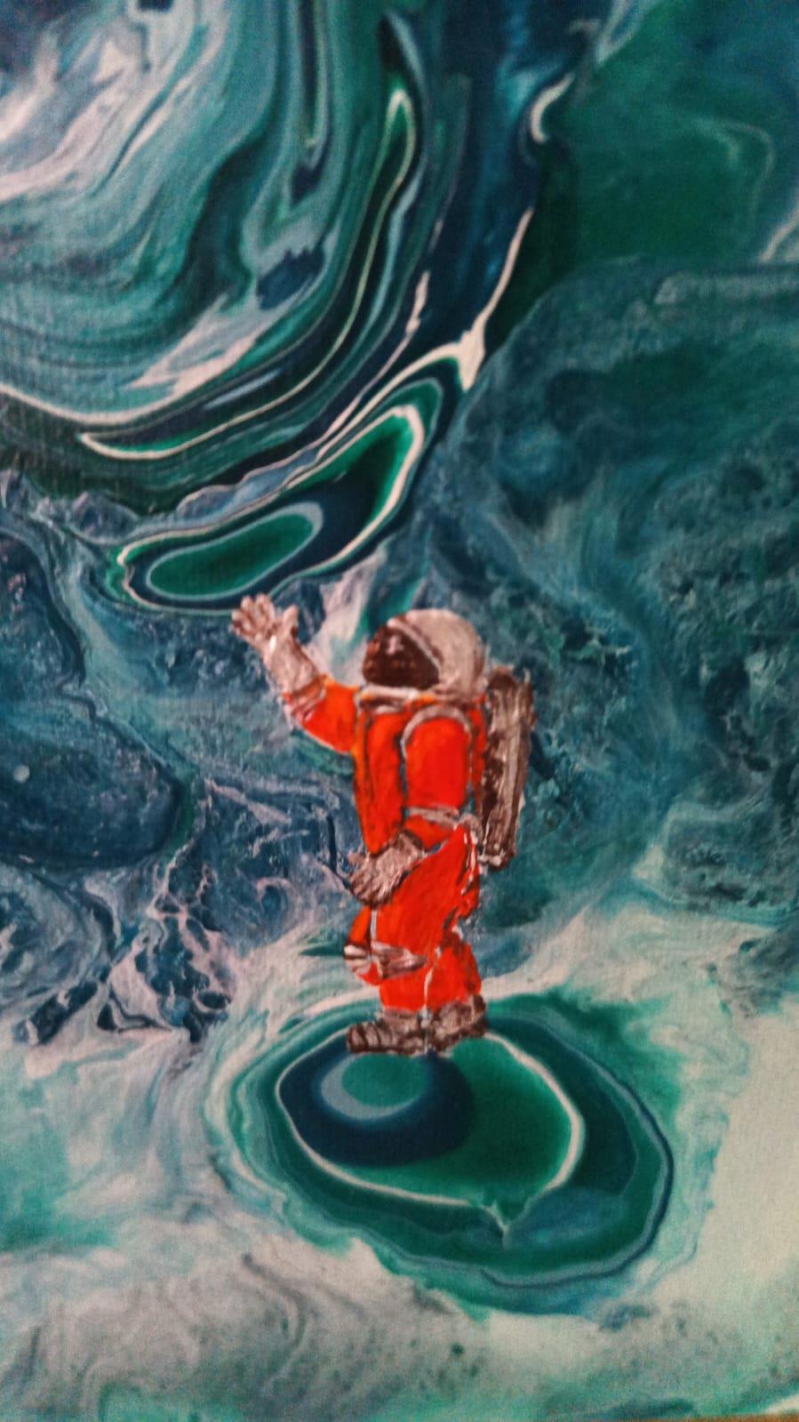 Текучий акрил, который арт флюид долго сохнет, но даёт такой шикарный стимул для воображения - мало, что сравнится с ним. Мне кажется расцветка скафандра, как у первопроходца космического оказалась в тему. Довольна как маленький, толстый слон. Пойду повешу куда-нибудь, пока не разонравилась)))