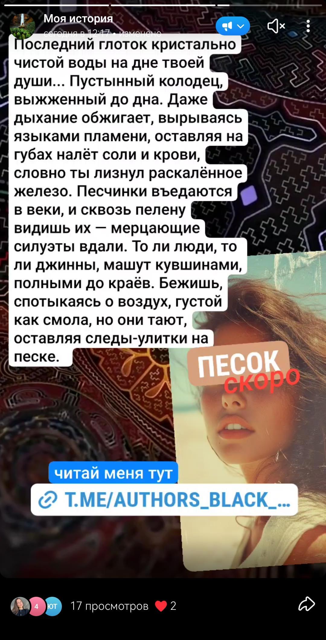 Автор: Mihail KuzbozhevПоследний глоток кристально чистой воды на дне твоей души... Пустынный колодец, выжженный до дна. Даже дыхание обжигает, вырываясь языками пламени, оставляя на губах налёт соли и крови, словно ты лизнул раскалённое железо. Песчинки въедаются в веки, и сквозь пелену видишь их — мерцающие силуэты вдали. То ли люди, то ли джинны, машут кувшинами, полными до краёв. Бежишь, спотыкаясь о воздух, густой как смола, но они тают, оставляя следы-улитки на песке.