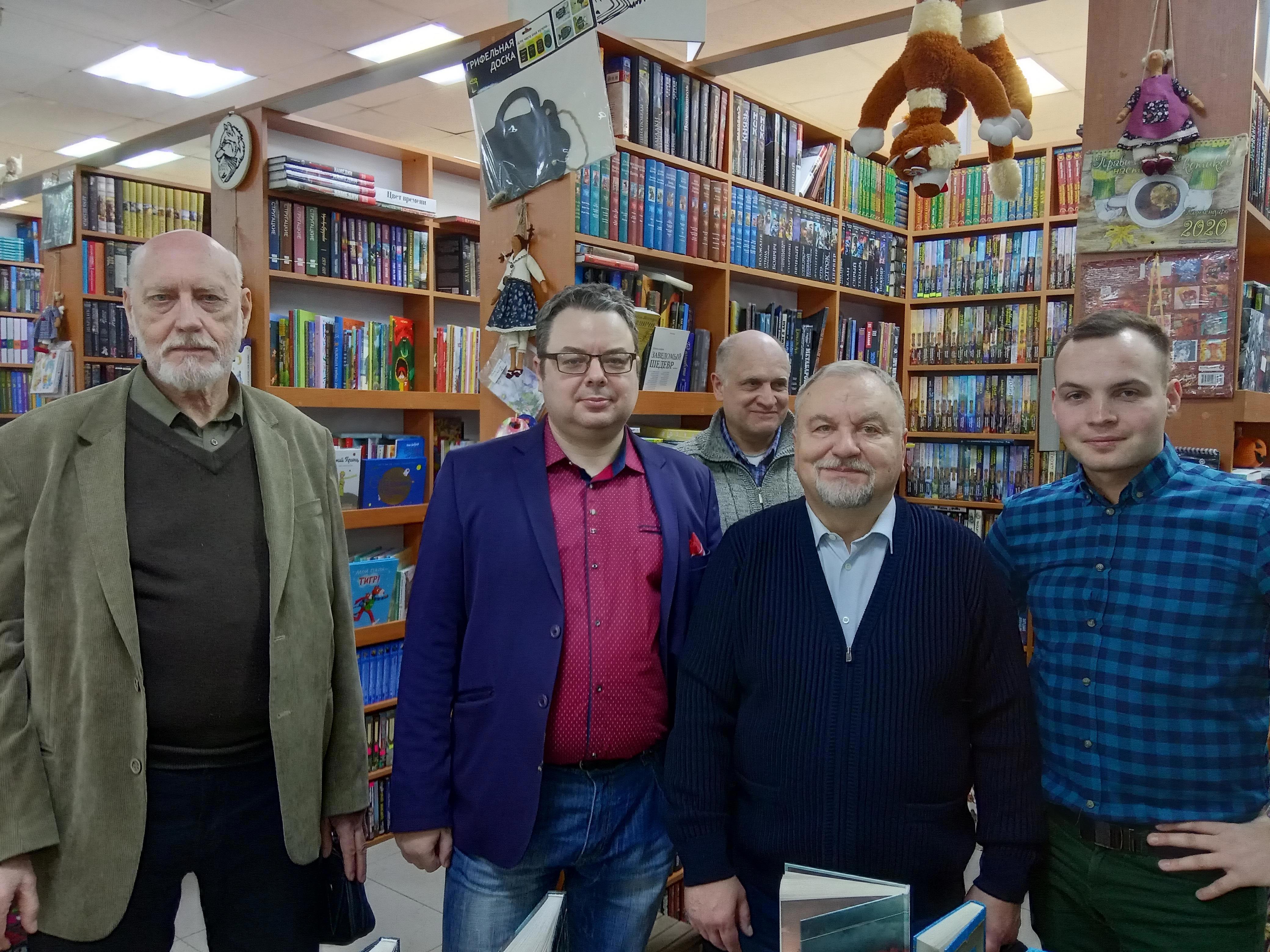 А вот давняя встреча в "Книжном дворике". Слева направо: белорусский фантаст Евгений Дрозд, Алексей Свадковский, читатель на заднем плане, я и Дмитрий Шелег.