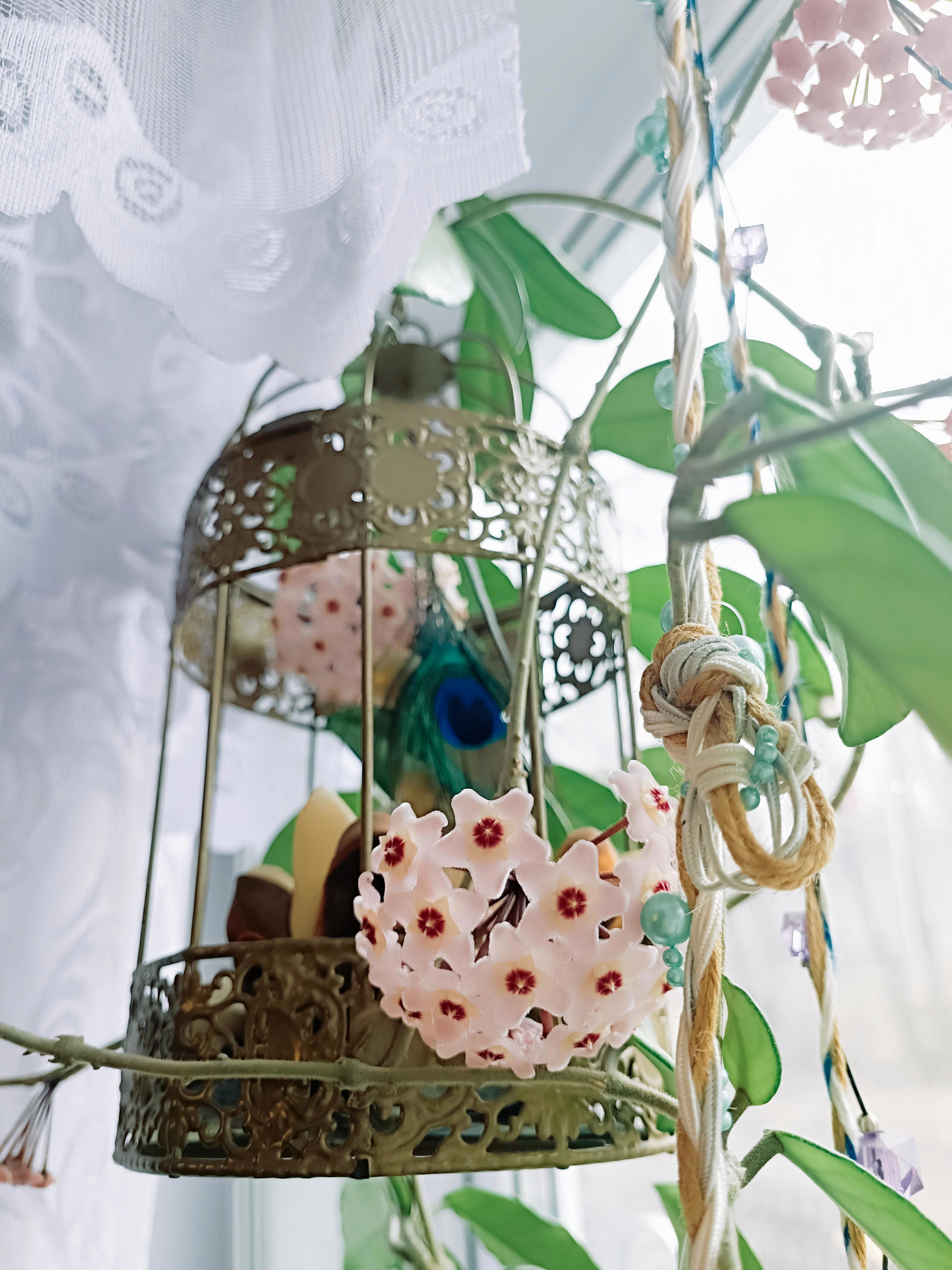 А это хойя, она же восковой плющ, которая проросла в птичью клетку и вся усыпана цветами: