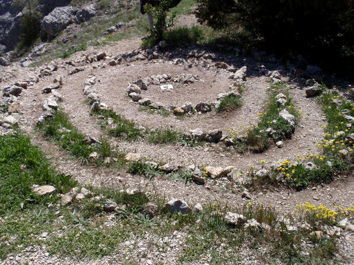 Каменный Цветок, или Храм Солнца очень красив – это центральный камень (Алтарь) и семь камней, обрамляющий его раскрытыми лепестками. Большое обозревается издалека; просто войдя внутрь Цветка, и даже забравшись на Алтарь, замысла природы не увидеть. Мы тоже посидели, ногами поболтали и загадали желания. Увидеть Каменный Цветок во всей красоте можно лишь идя к вершине Ильяс-Кая.