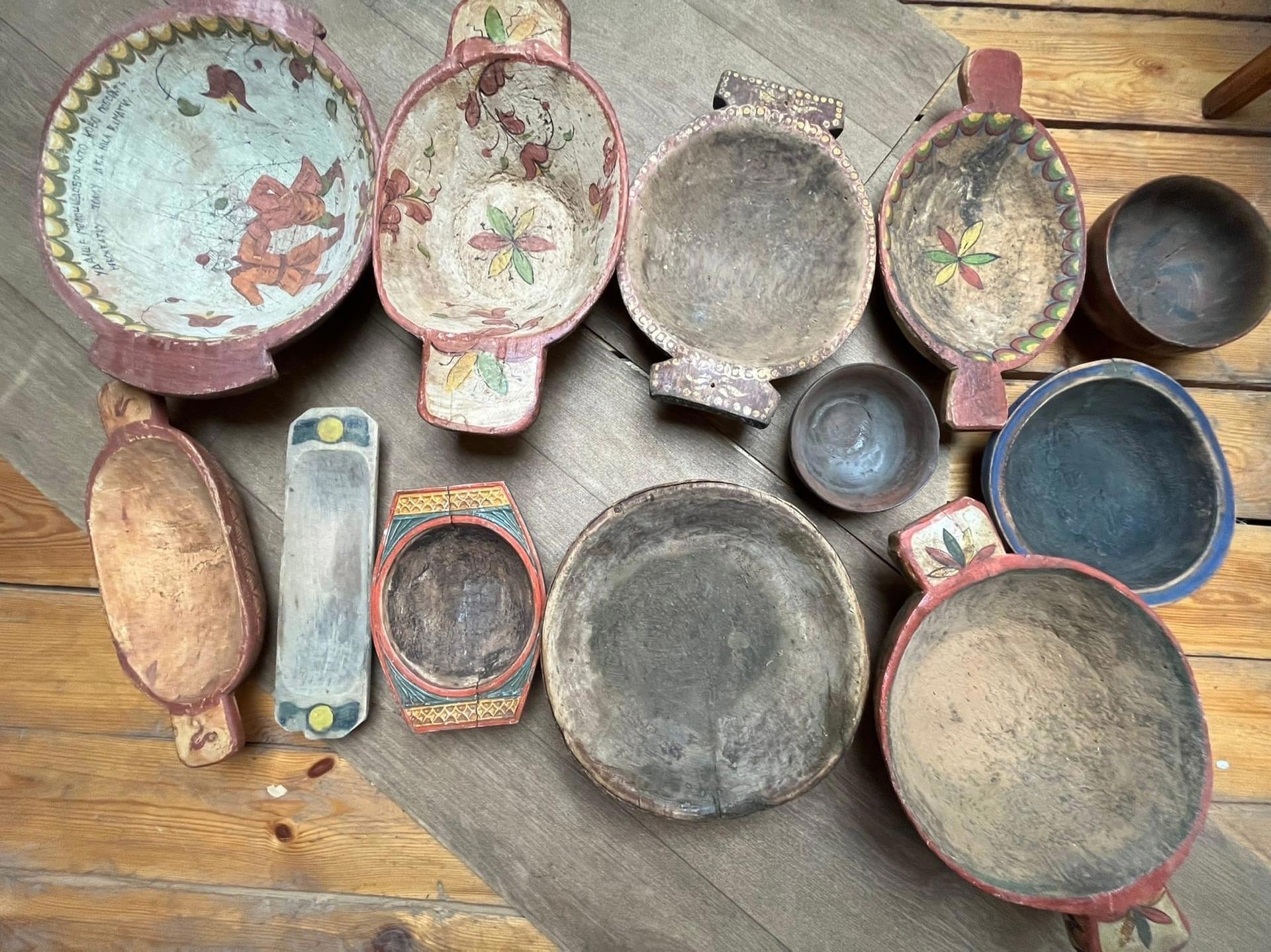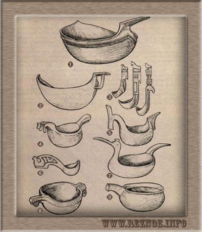 Русская праздничная посуда. XVII-XIX вв.: 1 - каповый ладьевидным московский ковш; 2 - большой Козьмодемьянским ковш; 3 - Козьмодемьянские ковши-черпаки; 4 - тверской ковш “конюх”; 5 - ковш ярославско-костромского типа; 6 - вологодский ковш-налевка; 7 - северодвинский скопкарь; 8 - тверская ендова; 9 - северодвинская ендова.