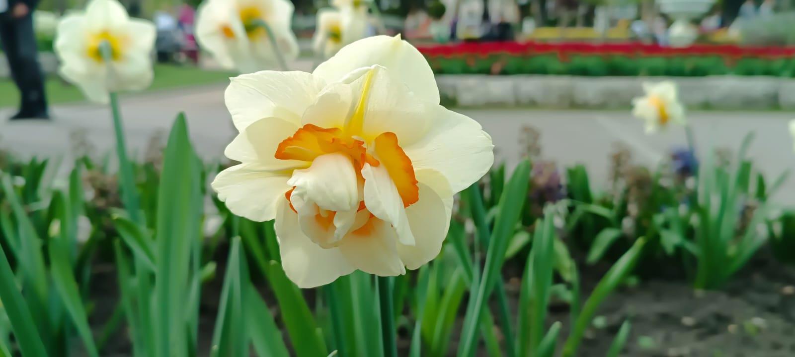 Хотя тюльпаны будут главным козырем парка, пожалуй, до середины мая, но есть клумбочка с нарциссами и несколько клумб покрыто "ковром" из анютиных глазок.