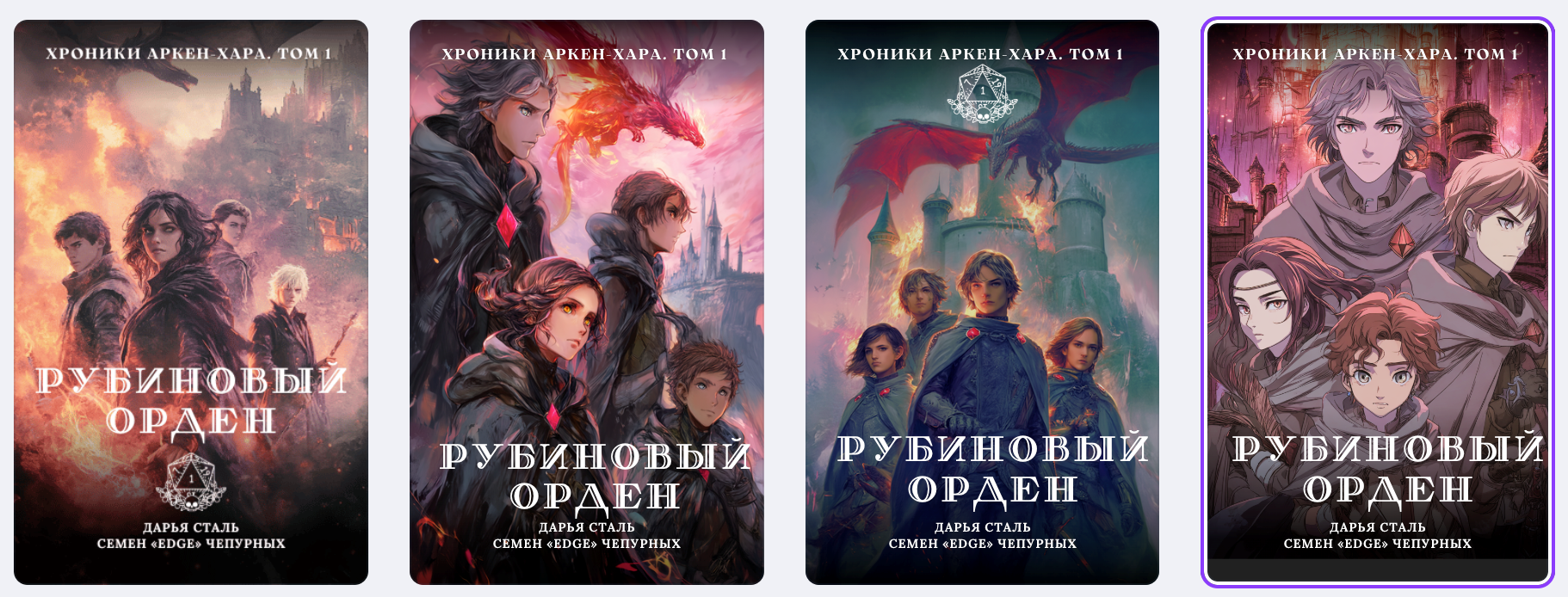 Автор: Дарья СтальУважаемые знатоки, писатели и читатели, мне вот кажется, что обложка «Рубинового ордена» не очень и я пытаюсь всячески сгенерировать новую. Это сложно, потому что нейросеть вечно не попадает с портретами в 4 героев! И тем не менее, вот все версии, что у меня были раньше: