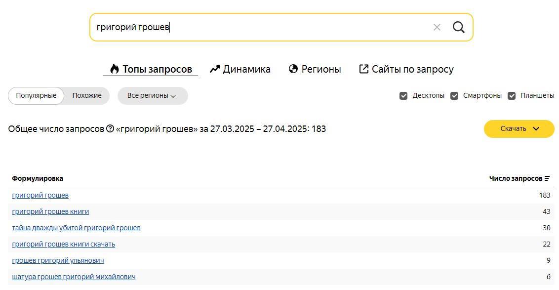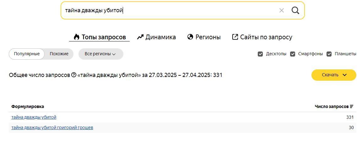 Так вот, когда я общаюсь с авторами по поводу Книгоежа (это мой блог в Дзене), мы часто говорим про популярность. И многим начинающим и продолжающим "середнякам" хочется узнать, есть у них аудитория или нет. Есть способ проверить это, и он достаточно объективен. Это вордстат от яндекса (дзена). Например, 5 месяцев назад меня не искал никто. Сегодня определённый интерес есть: