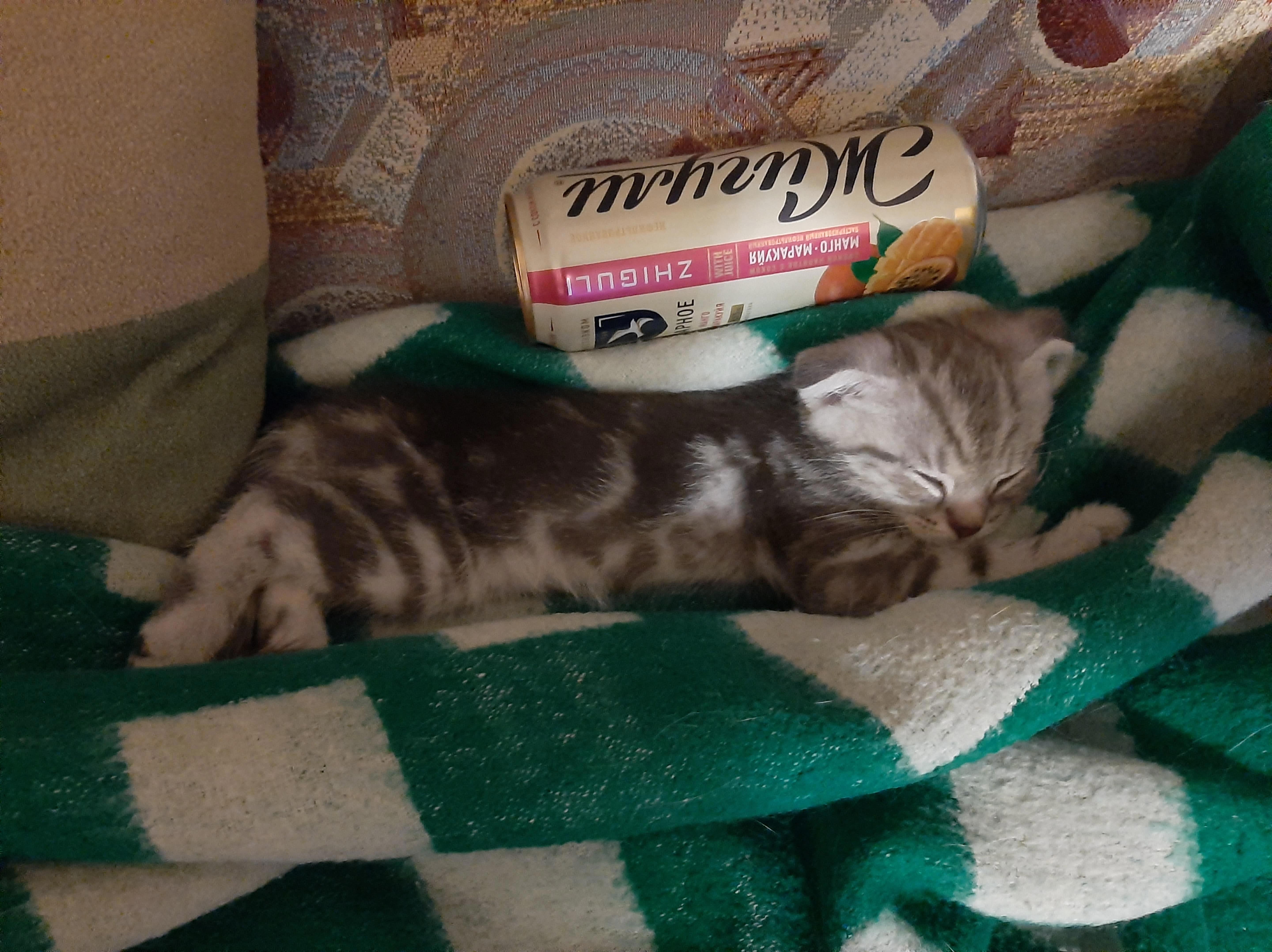 Итак, таким появился в нашем доме король Кеннет Одиннадцатый (банка для масштаба). После покойного Маркуса он показался нам совсем микроскопическим, поэтому первое время он носил, помимо прочего, имена Минибро, Микрокот и Нанокотик.