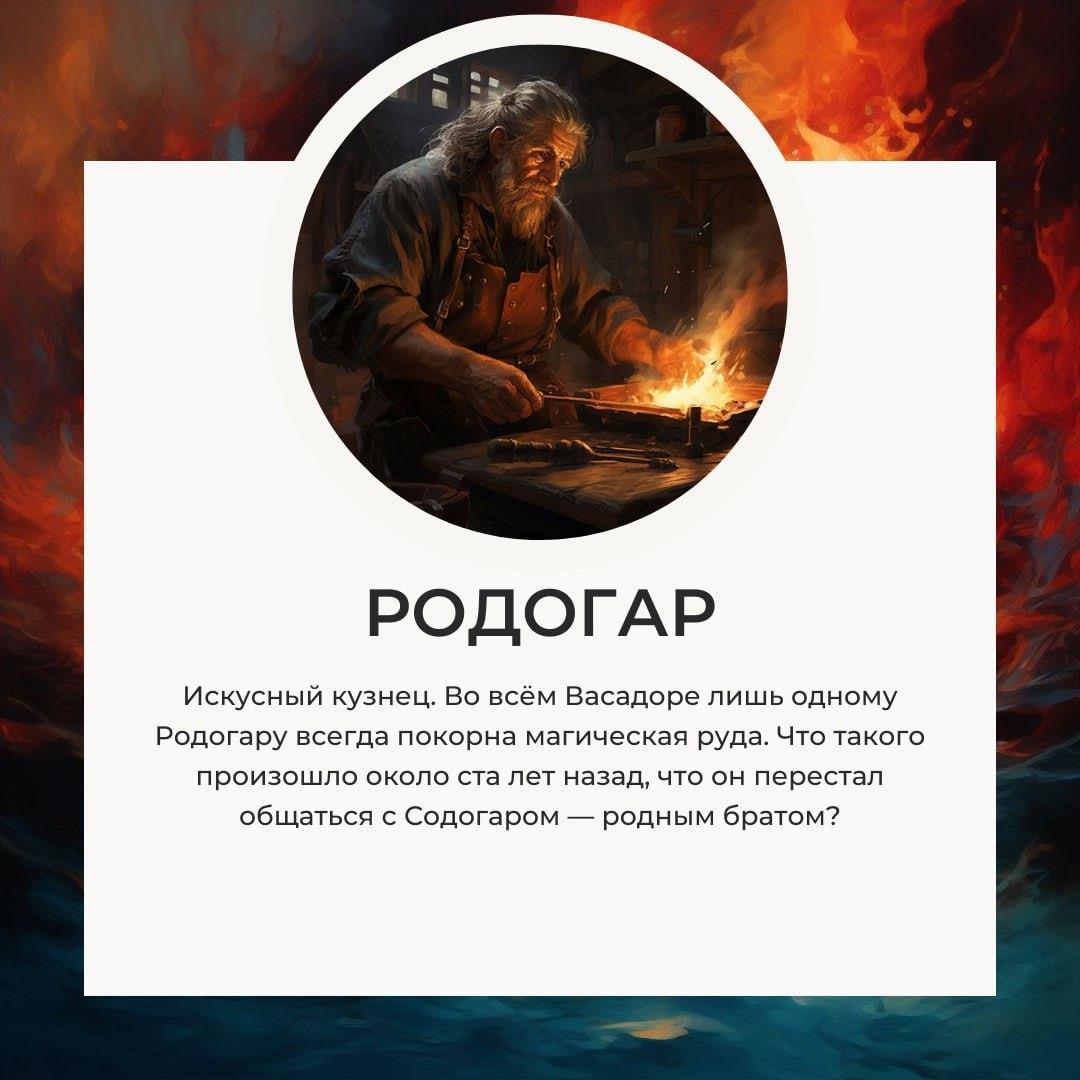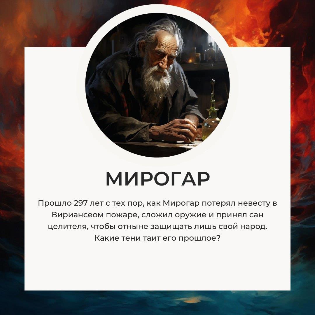 А здесь я, пожалуй, покажу карточки персонажей. (прим.: иллюстрации к интервью) На самом деле я всех своих героев очень люблю. Но Мирогар, наверное, сейчас в моей голове продуман детальнее всех.
