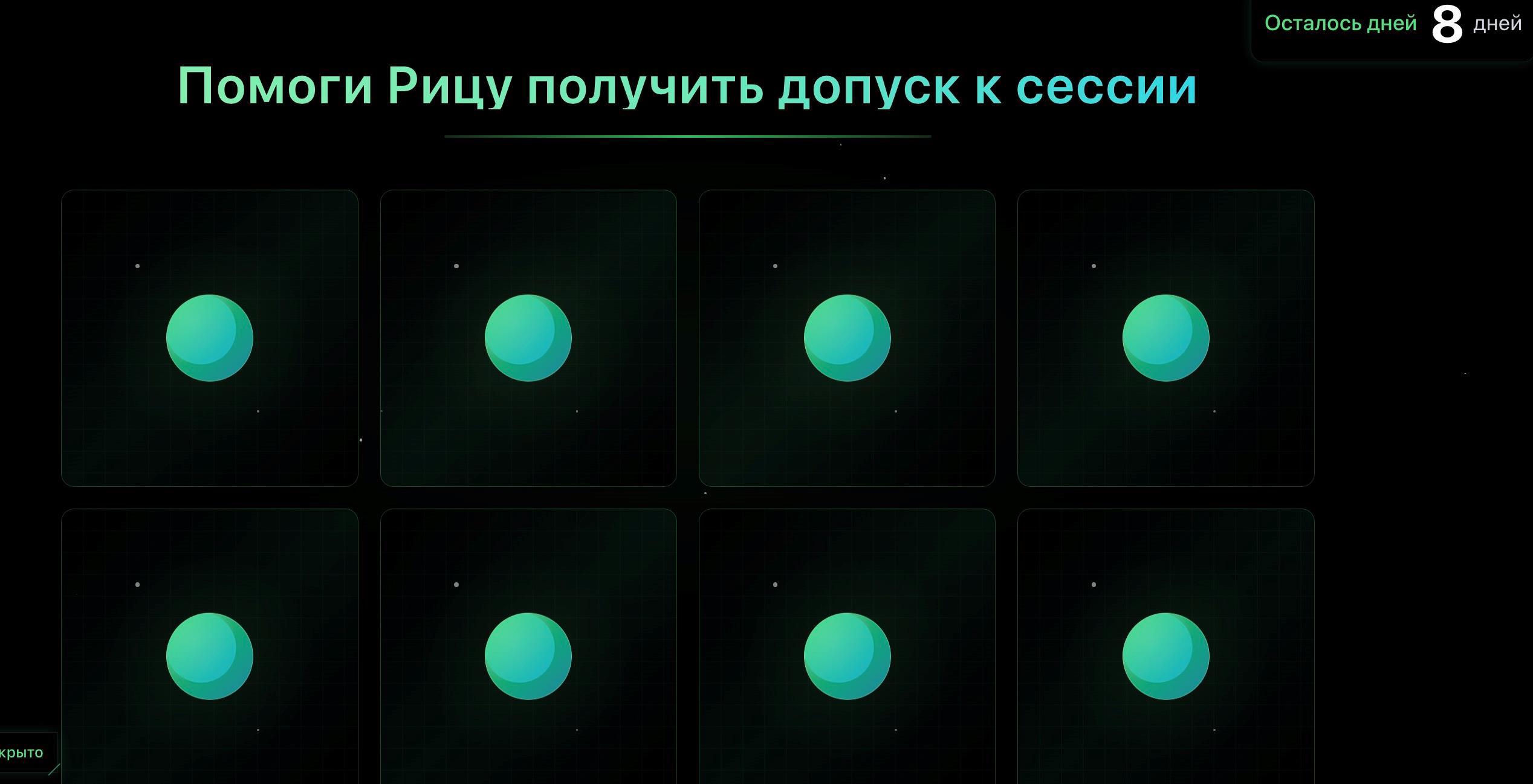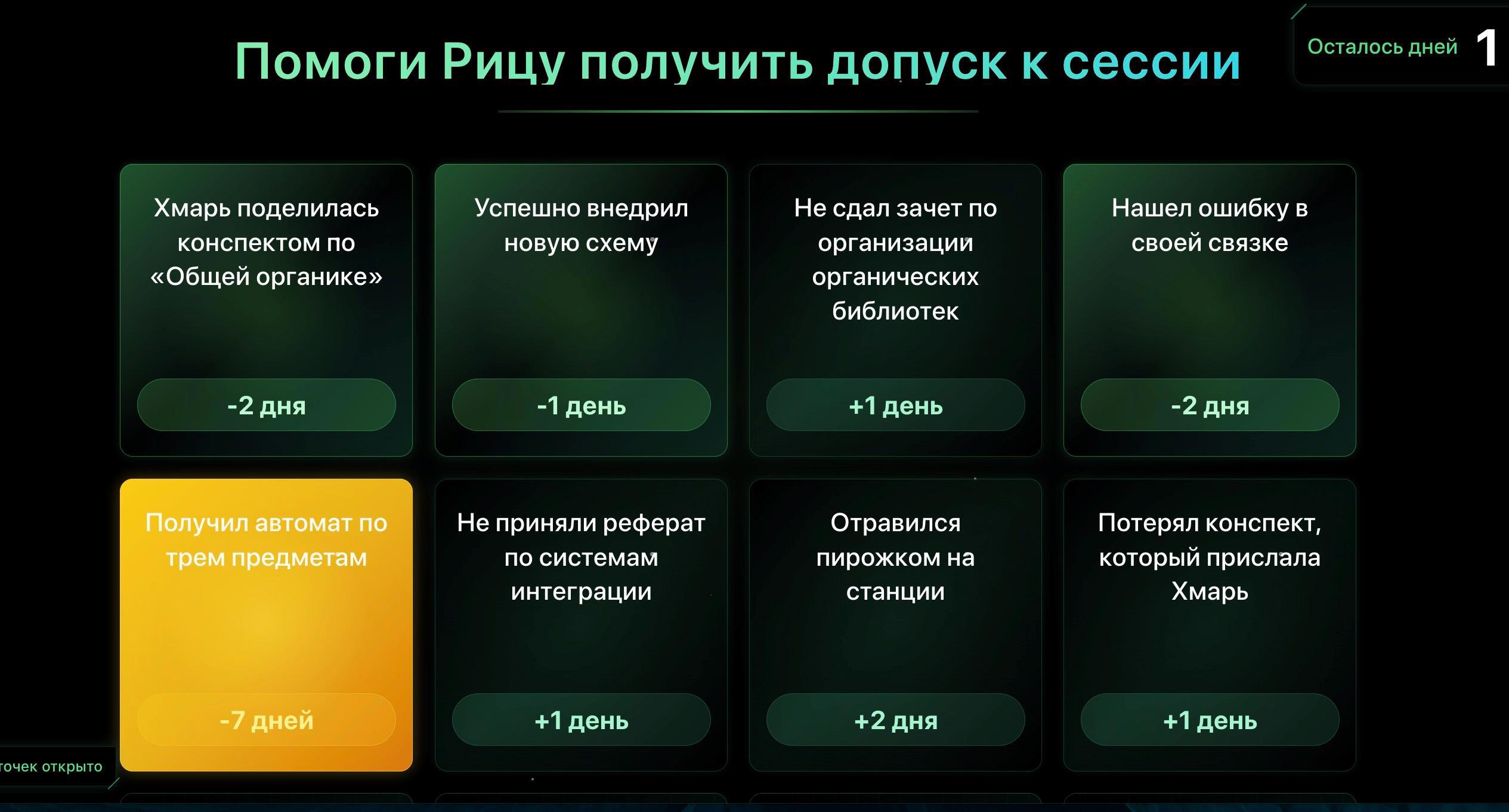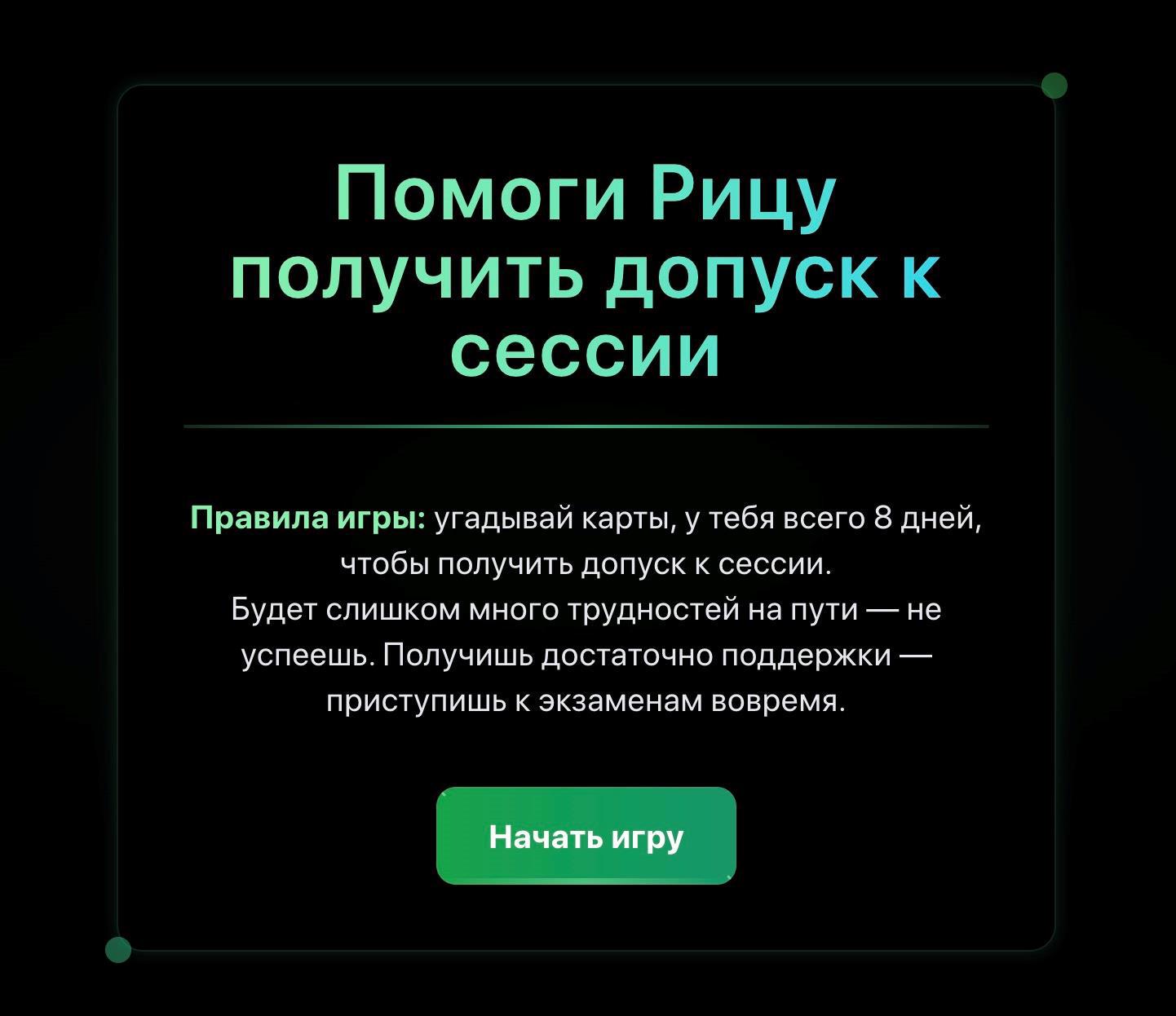 предлагаю вам игру по Брутфорсу. Игра простая, задача — помочь Рицу получить допуск к сессии, нажимая на карточки в любом порядке. Сессия имелась в виду зимняя, но это не существенно. Надо открывать карточки и сокращать время до нуля, и если это удалось, то ура, Риц допущен к сессии. Если нет, то нет. События выпадают плохие и хорошие. Предусмотрена одна золотая карта, которая позволяет рывком сократить разрыв до срока, но она выпадает не каждый раз.