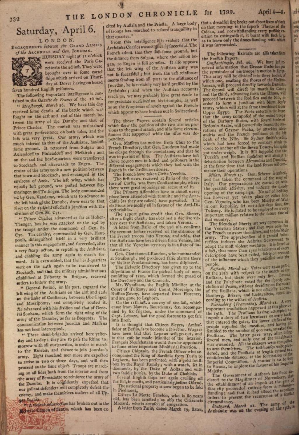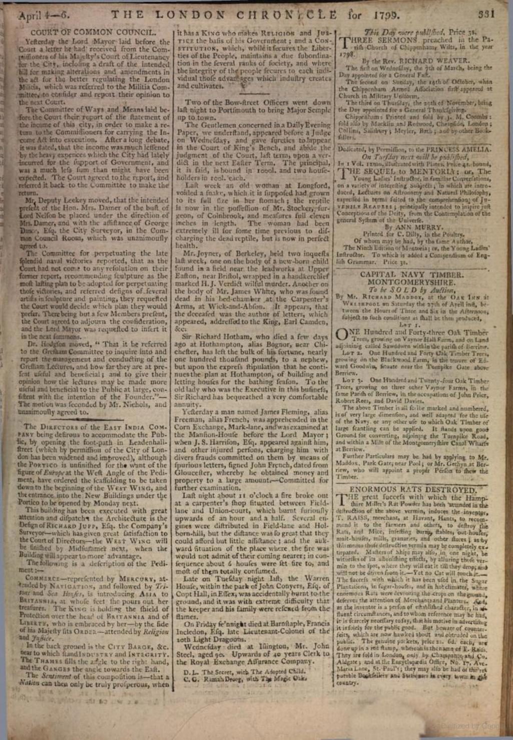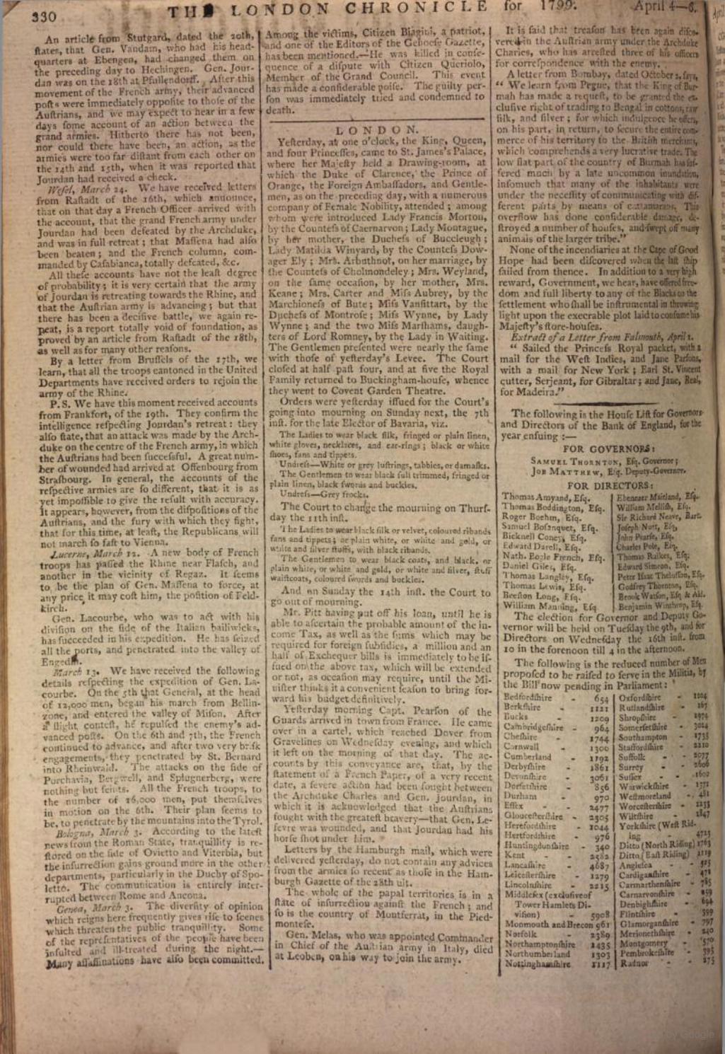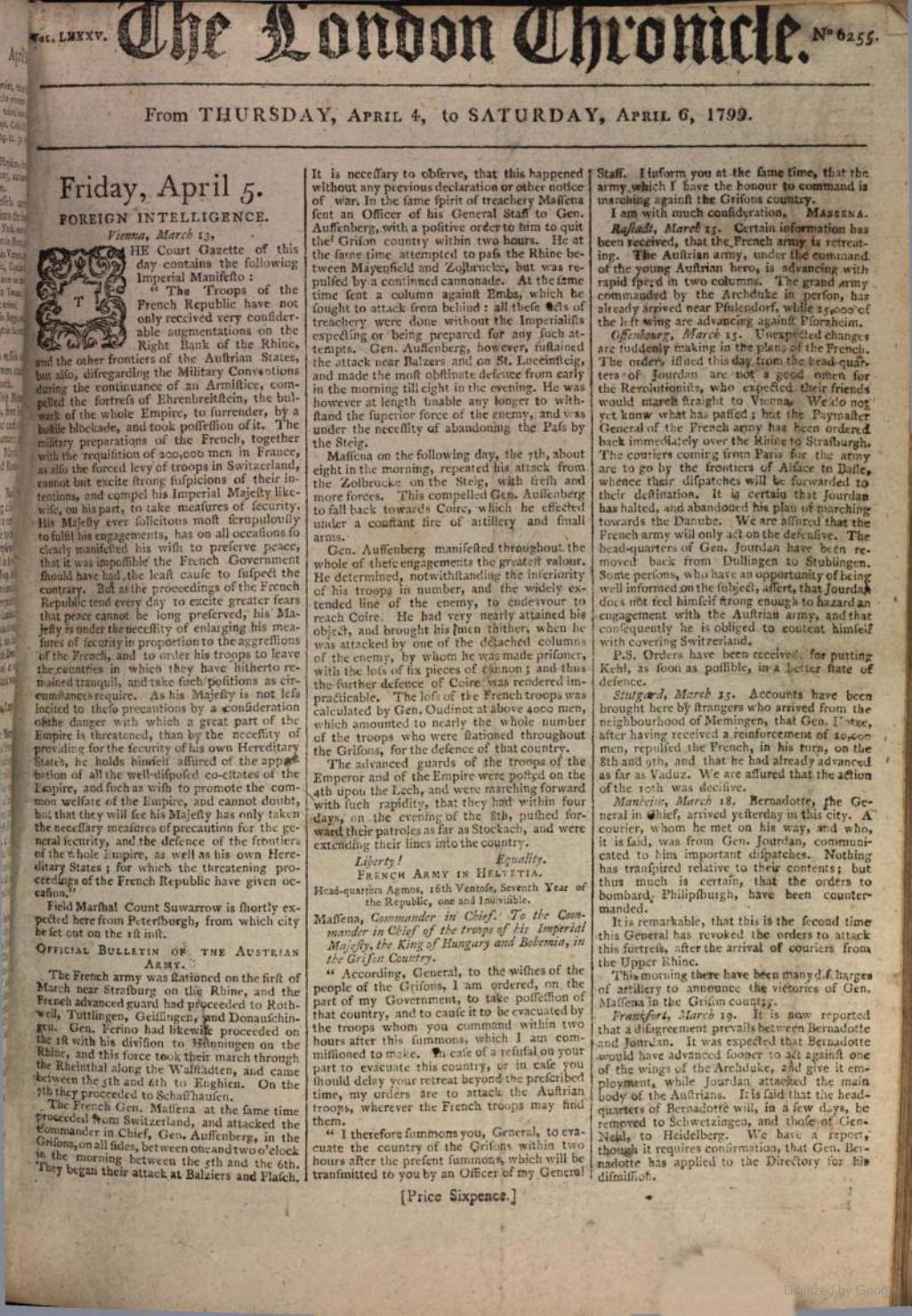 К примеру — The London Chronicle была одной из газет рубежа 18-19 веков печатавшейся в Лондоне в то время. Выходила три раза в неделю и содержала мировые и национальные новости, а также освещала художественные, литературные и театральные событий в столице.