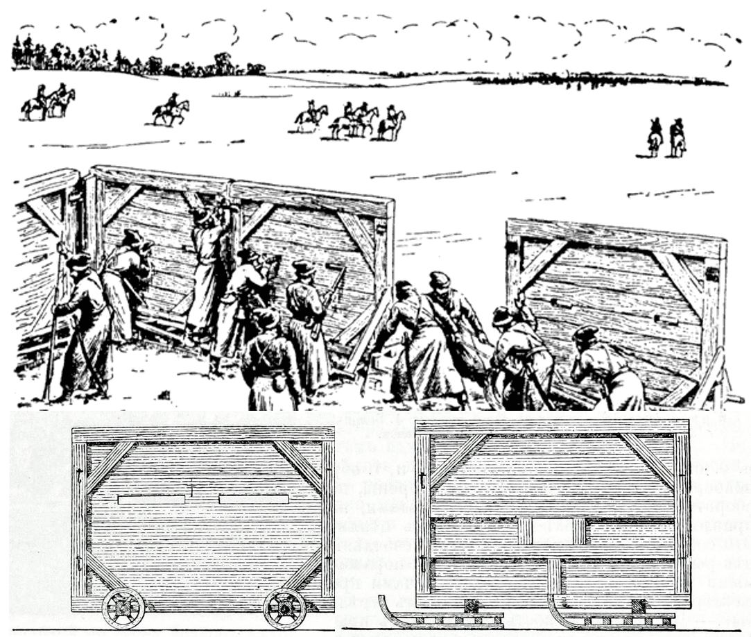 Одним словом Трубецкой принял непростое решение об отступлении - чем в какой-то мере предвосхитил отступление Кутузова после Бородино. И вот тут-то на первые роли вышел Николай Бауман, вставший со своими солдатами в арьергарде! Я все не мог понять, за какие такие заслуги полковнику впервые присвоили звание "генерал-поручика"... И что же? Как оказалось, именно Бауман по весне 1659 года предлагал проект именно передвижного укрепления из телег для достаточно крупных отрядов. Очевидно, вся разница с гуляй-городом заключалась в том, что "город" у нас является стационарным укреплением - в то время как Бауман предложил вариант буквально передвижной крепости.