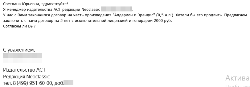 "Продолжение сотрудничества с редакцией Neoclassic издательства АСТ для меня возможно при соблюдении двух условий: