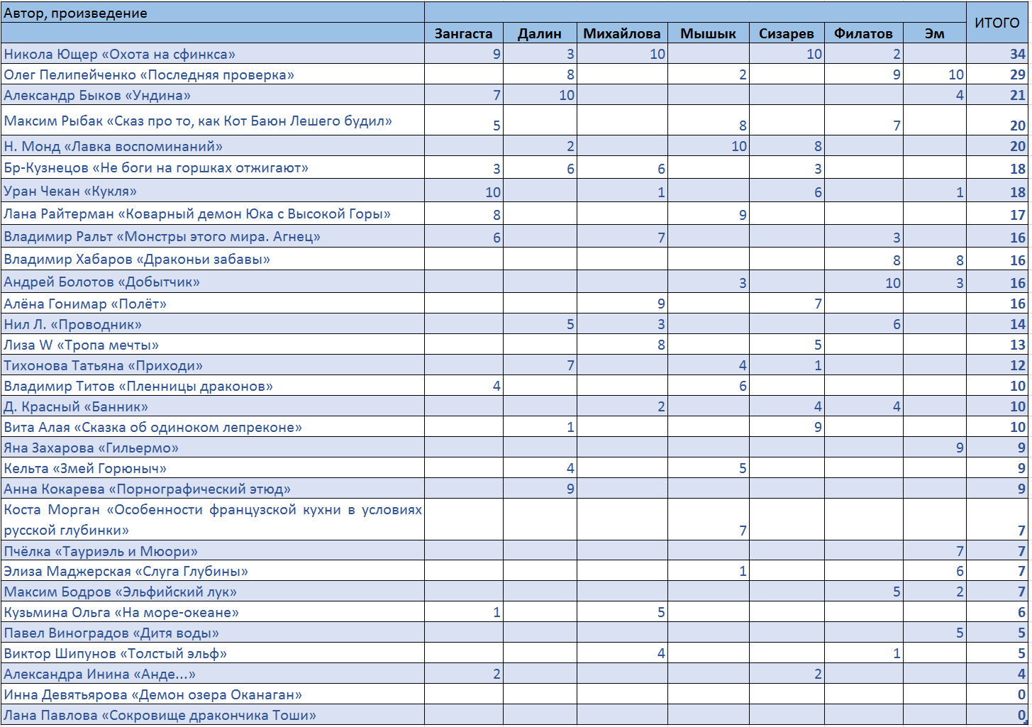 - Никола Ющер «Охота на сфинкса» 10 баллов. Автору удалось вместить в небольшой рассказ прямо-таки романное повествование с детективной составляющей.
