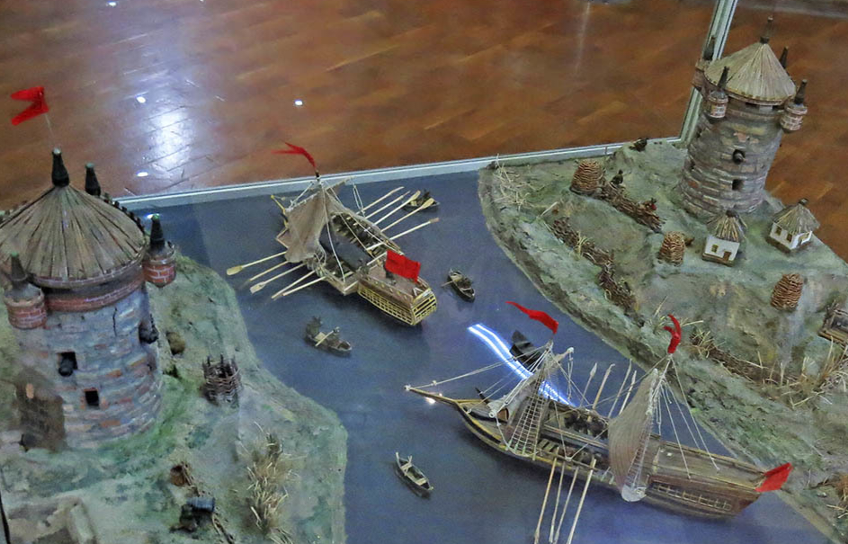 К слову говоря, те самые азовские каланчи не были какими-то "просто" кирпичными башенками. Это, почитай, настоящие крепости с постоянным гарнизоном и мощным пушечным вооружением. Причём нижний ярус орудий был надёжно спрятан в каменных казематах, что впору говорить о дотах! На музейном макете, кстати, нет бастионных стен, прикрывающих подход к башням:
