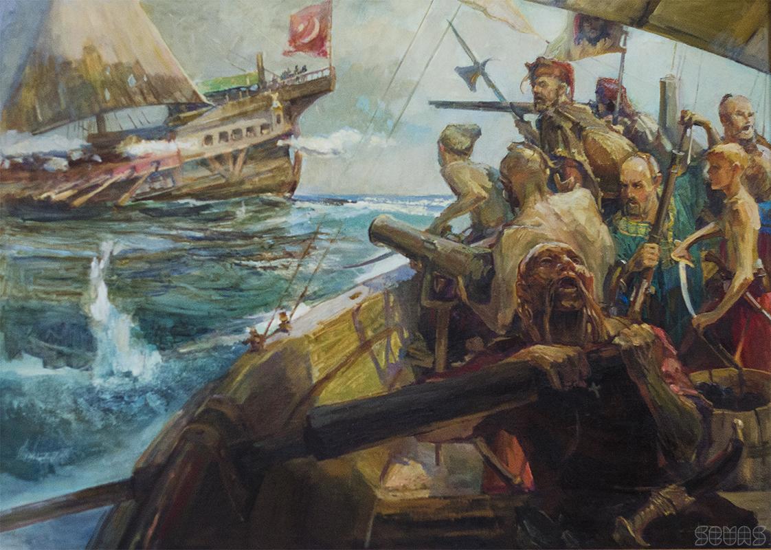 Стараясь не соваться к носу, они кружили вокруг турецких кораблей, расстреливая команды врага частыми залпами. При этом пока стрелял один борт, которым и сблизились с турками, второй перезаряжал пищали... Были у казаков и небольшие "вертлюжные" пушки, палившие картечью.