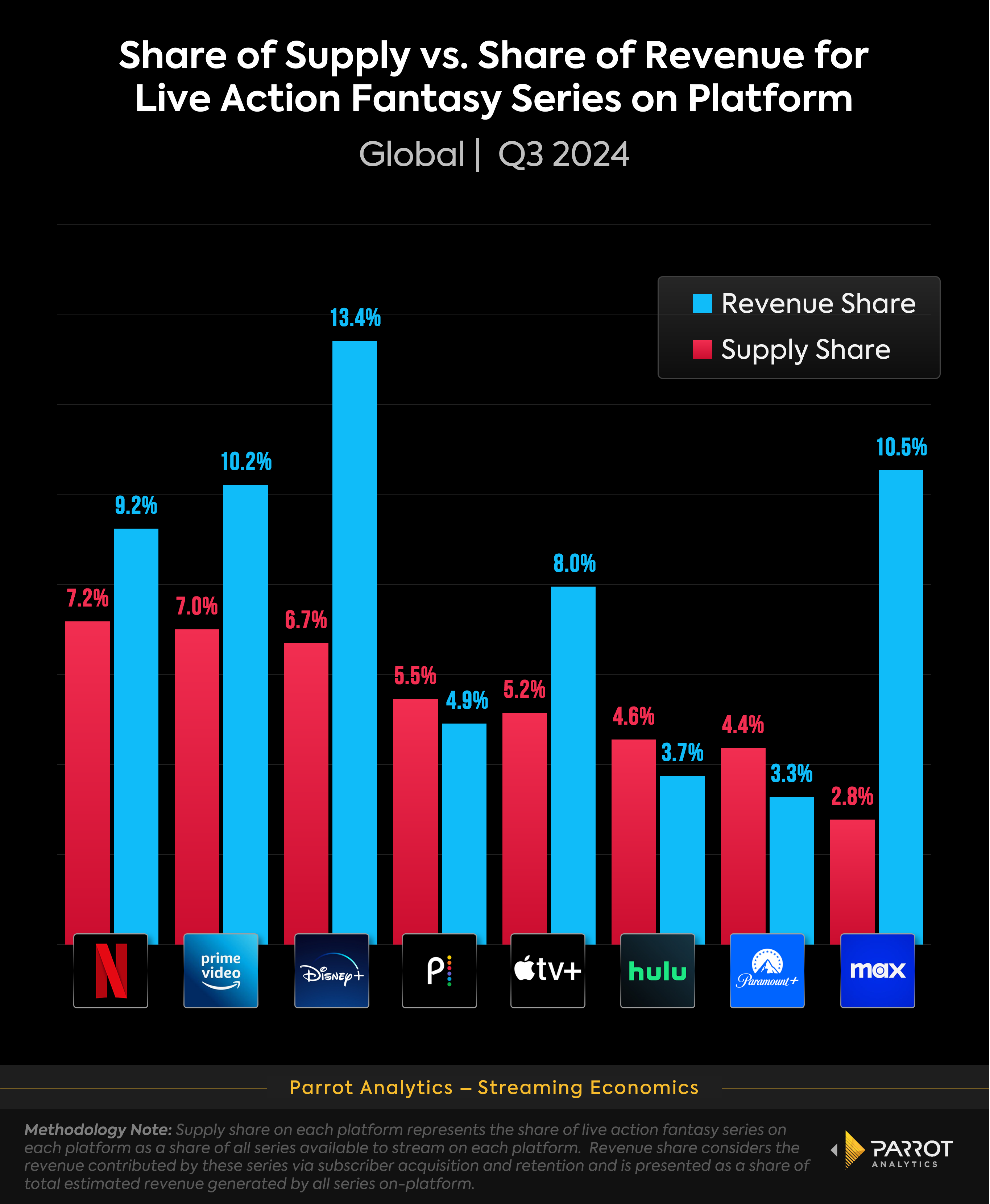 В статье (https://www.parrotanalytics.com/insights/rings-of-power-vs-the-wheel-of-time-amazon-revenue/) про Кольца власти и Колесо времени (две большие фэнтези франшизы на Prime Video от Амазон) есть интересная картинка (они ниже). На ней указано сколько процентов от общего количества контента является фэнтези (красные столбцы), а также сколько процентов от общего дохода приносит фэнтези контент платформе (синие столбцы).