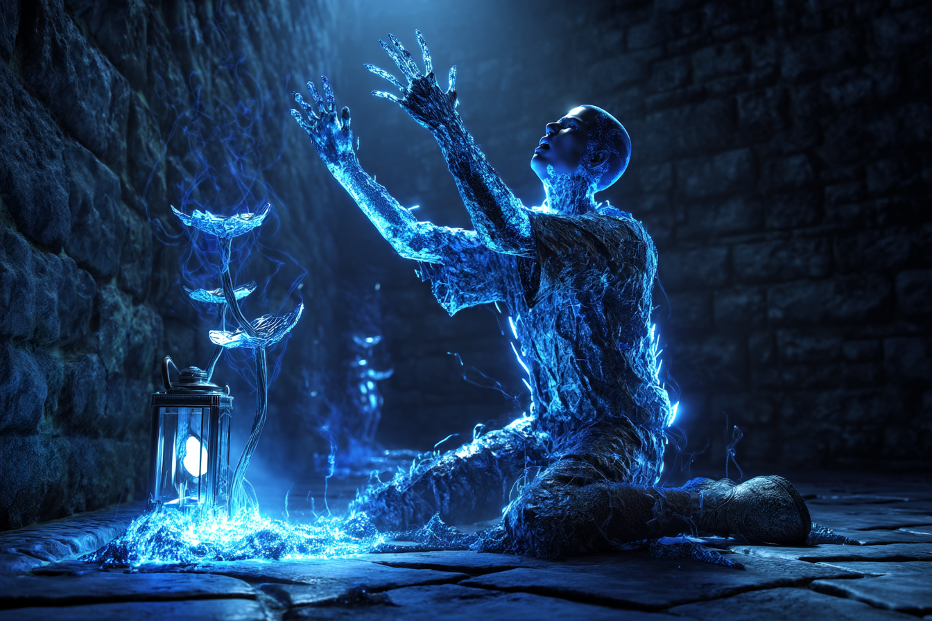 После начинается финальная метаморфоза: кристаллическая фигура начинает вибрировать, издавая тонкий, нарастающий звон. Постепенно статуя покрывается сетью трещин и рассыпается на тысячи сверкающих осколков, превращающихся в странную жидкую субстанцию. Эта эссенция медленно впитывается в камни подземелья, тем самым подпитывая колонию и позволяя ей разрастаться.