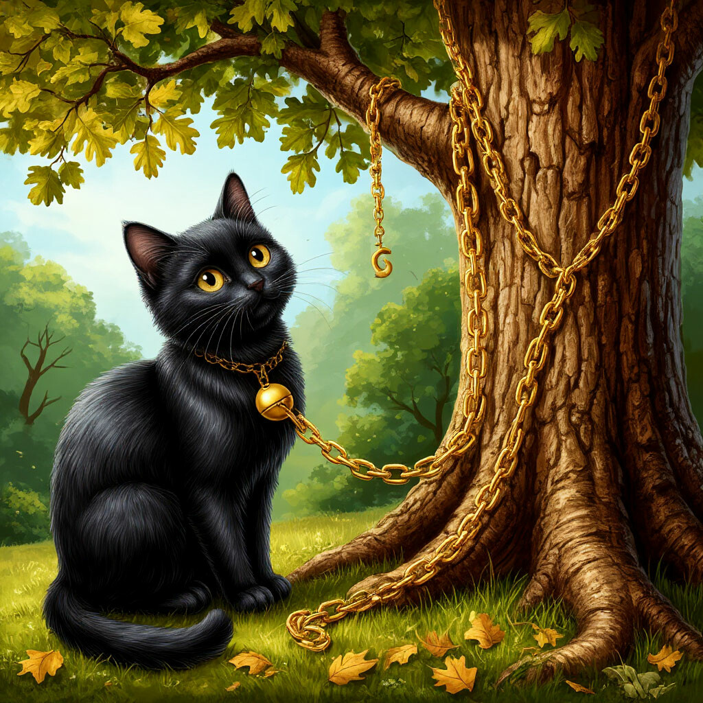Один хитрый кот-прохвост украл мешок золота. Чтобы легализовать добычу, он переплавил его в цепь, повесил на старый дуб у воды и прикинулся ученым.
