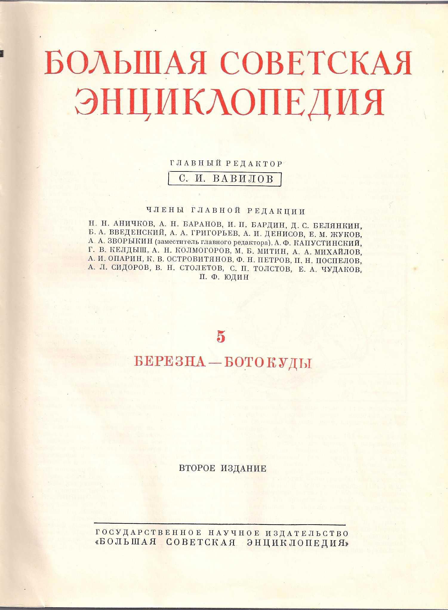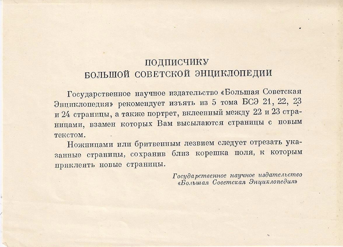 Государственное научное издательство "Большая советская энциклопедия" рекомендует изъять из 5-го тома БСЭ 21, 22, 23 и 24-ю страницы, а также портрет, вклеенный между 22 и 23-й страницами, взамен которых Вам высылаются страницы с новым текстом.