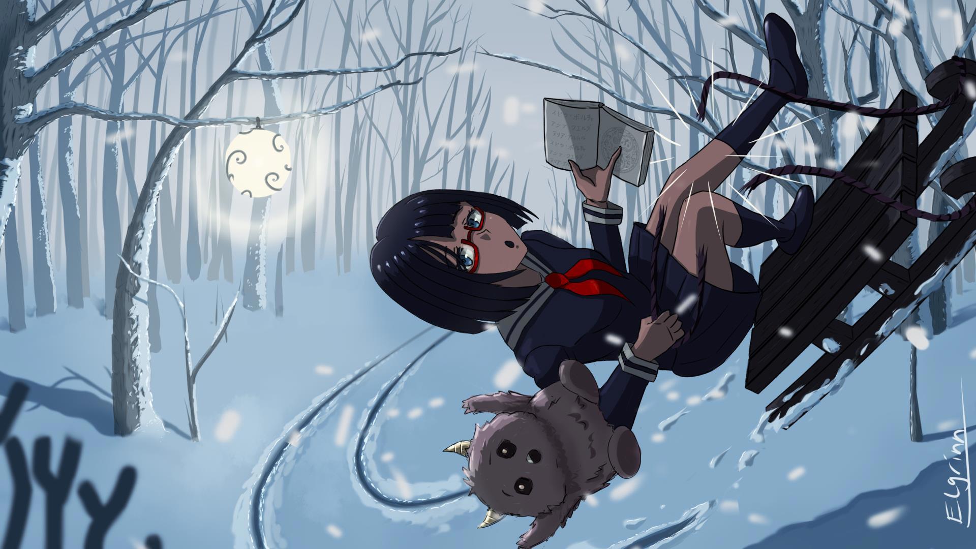 Изначально я не имел никакого плана относительно этого арта - помню, я просто горел мыслью "хочу нарисовать ч/б зимний лес, как у Сайконо". В качестве референса я для леса использовал одну из своих фотографий парка, по которому как-то гулял зимой. Девочка получилась в очках тоже потому, что на момент набрасывания основных элементов арта я был под впечатлением от "Зайчика" - то есть на её внешность немного повлиял персонаж Антон.