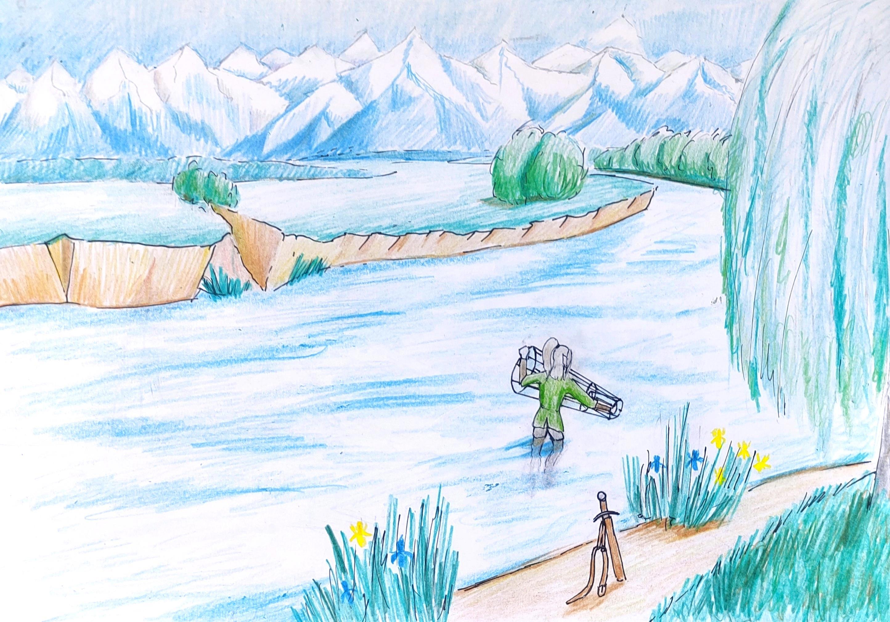 Белая в нижнем течении. Большая река, берущая исток в горах, и спускающаяся к океану через весь материк. Горы на заднем фоне - Закатные горы, северней в них стоит Академия.