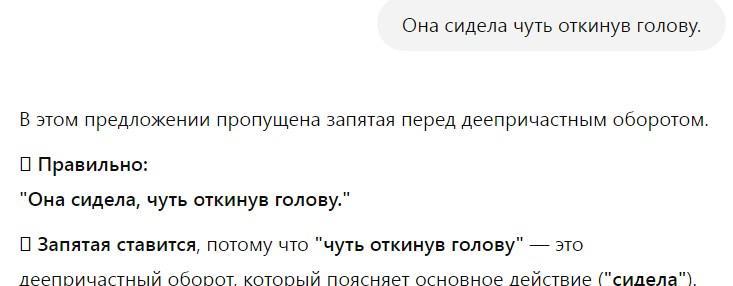 Дальше я подсовывал ИИ провокационные паттерны типа "Она сидела чуть откинув голову" (в современной парадигме правописания запятой здесь нет). ИИ все время ошибался, менторски поясняя мне, что там элементарный деепричастный оборот). Выводов из своих ошибок не делал, а дальше продолжал с тем же менторским тоном.