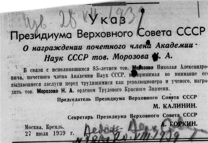 Чуть не забыл главное. Я ведь не план будущего романа сейчас показываю. Эта моя заметочка всё же вполне даже документальная. И она про Николая Александровича Морозова на самом деле. Вот он далеко не со всеми своими государственными наградами: